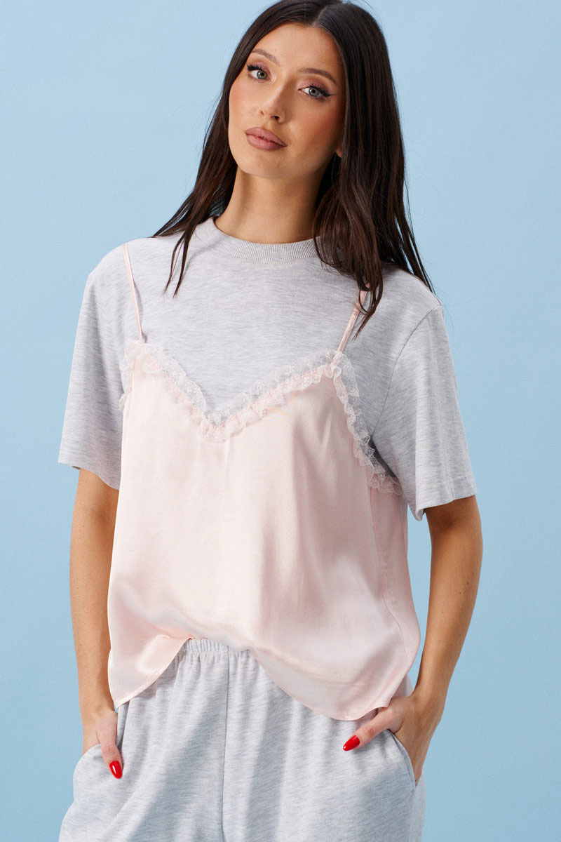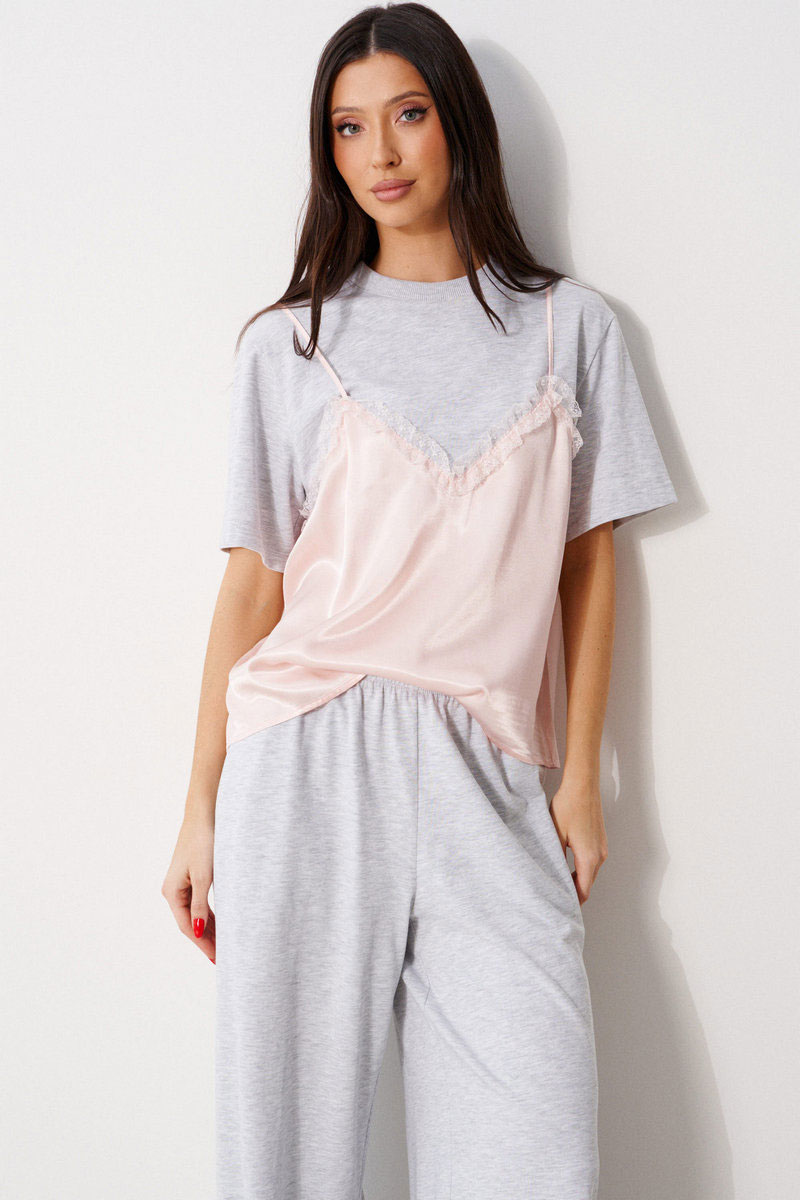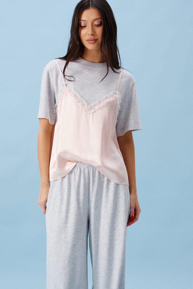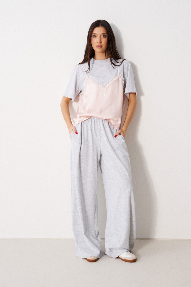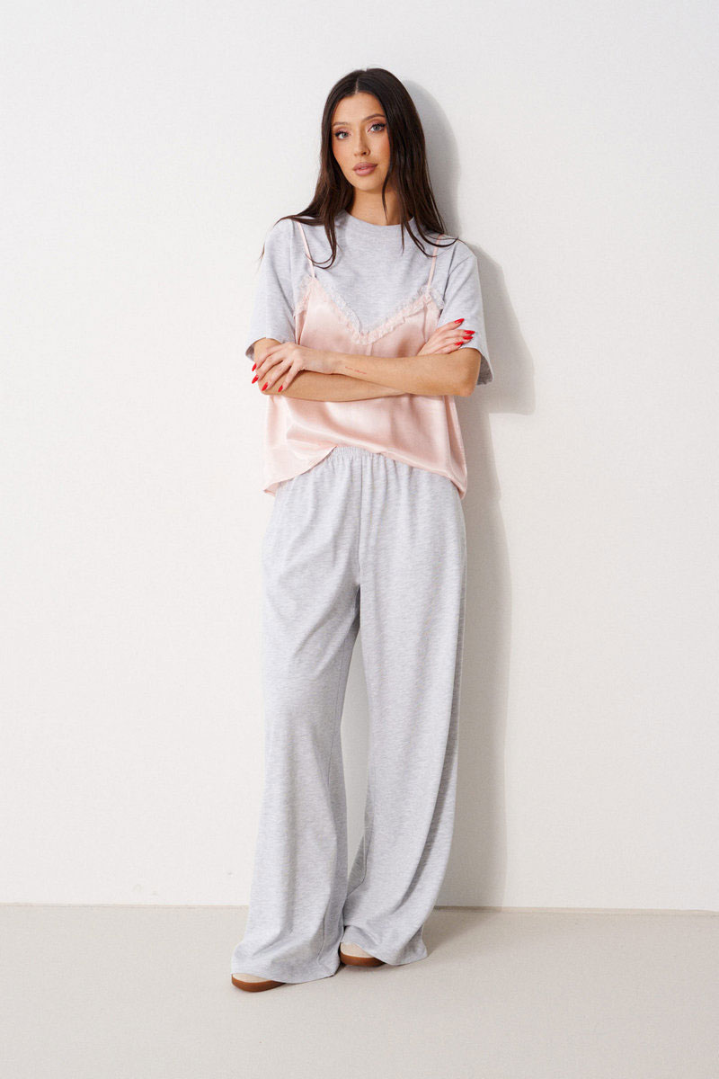 Брюки прямого, свободного кроя выполнены из трикотажного полотна серого цвета. Характеристики: прямой крой, пояс на резинке, в боковых швах карманы.