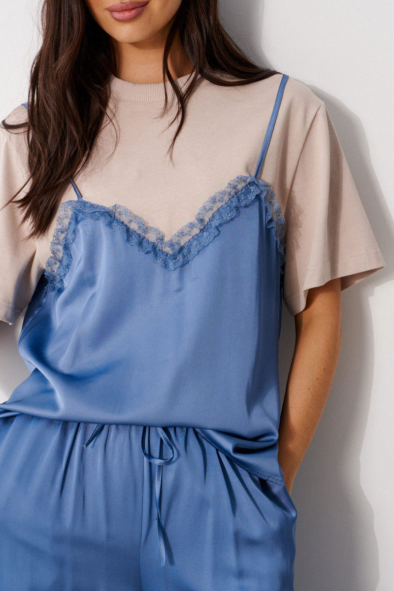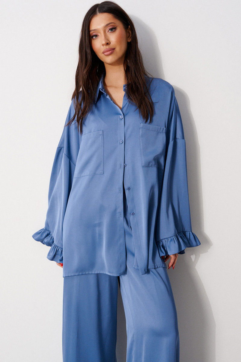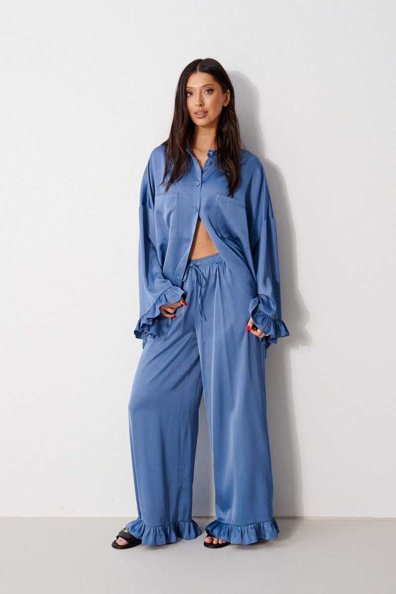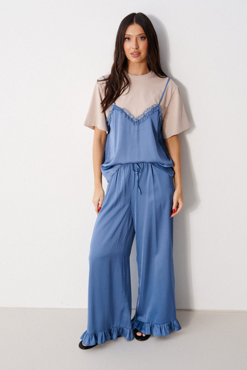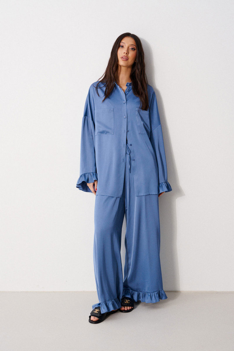 Брюки прямого свободного кроя, выполнены из струящейся ткани. Пояс брюк на резинке с кулиской, в боковых швах карманы, по низу изделия нашит волан.