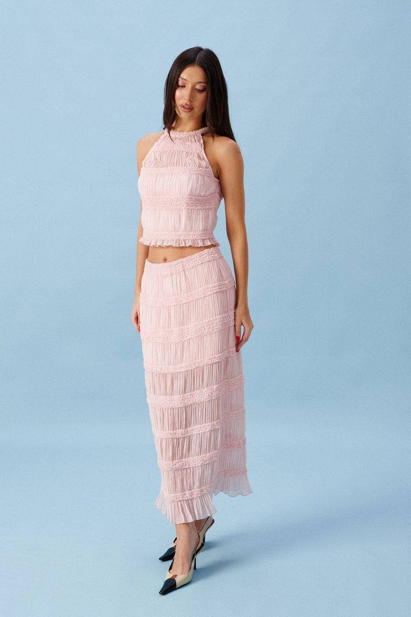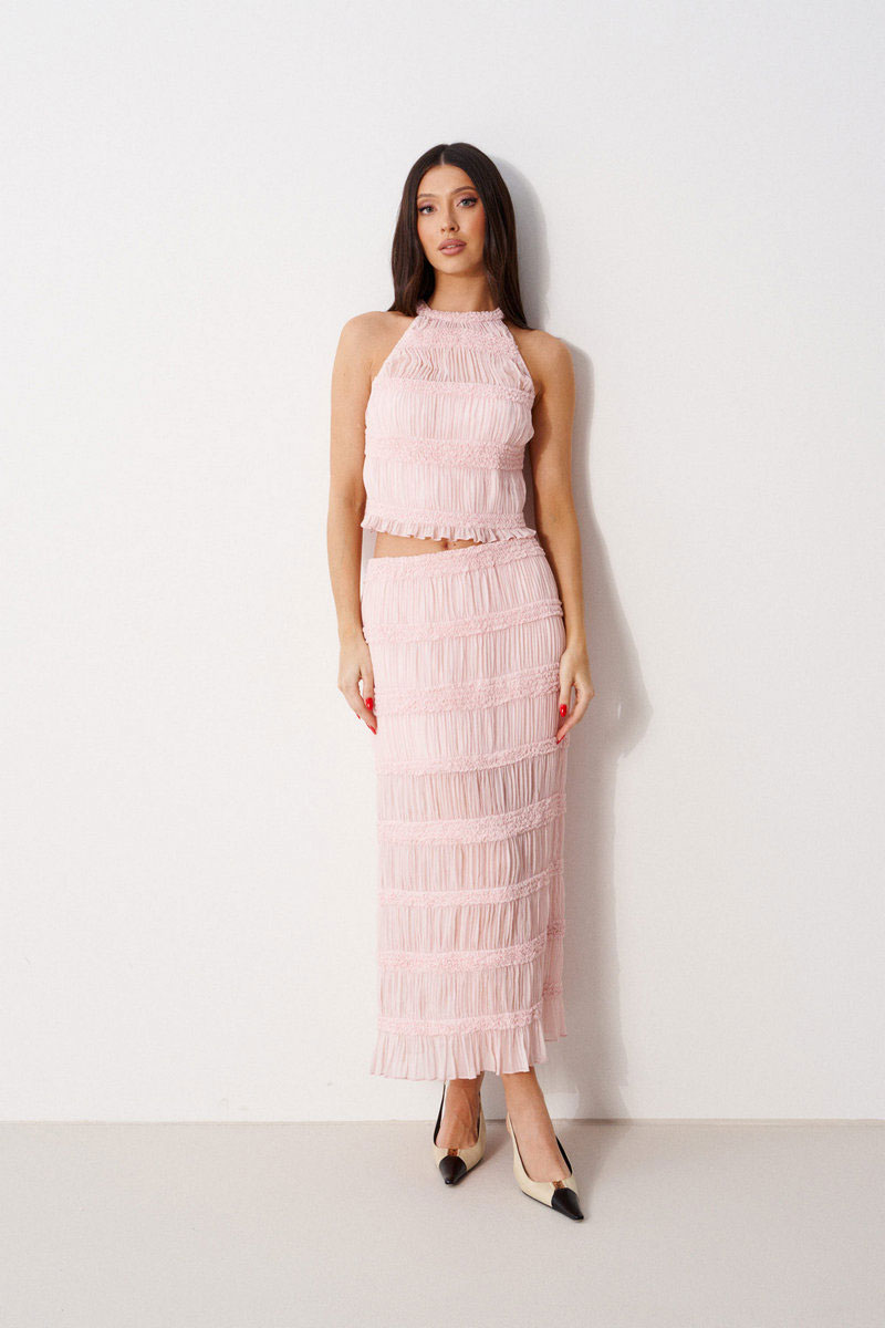 Юбка-миди полуприлегающего силуэта. Выполнена из прозрачной фактурной ткани нежно-розового цвета. С подкладкой в длине мини. Пояс на резинке. Застежки в изделии нет.