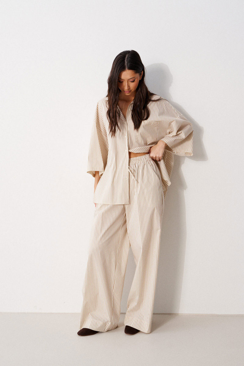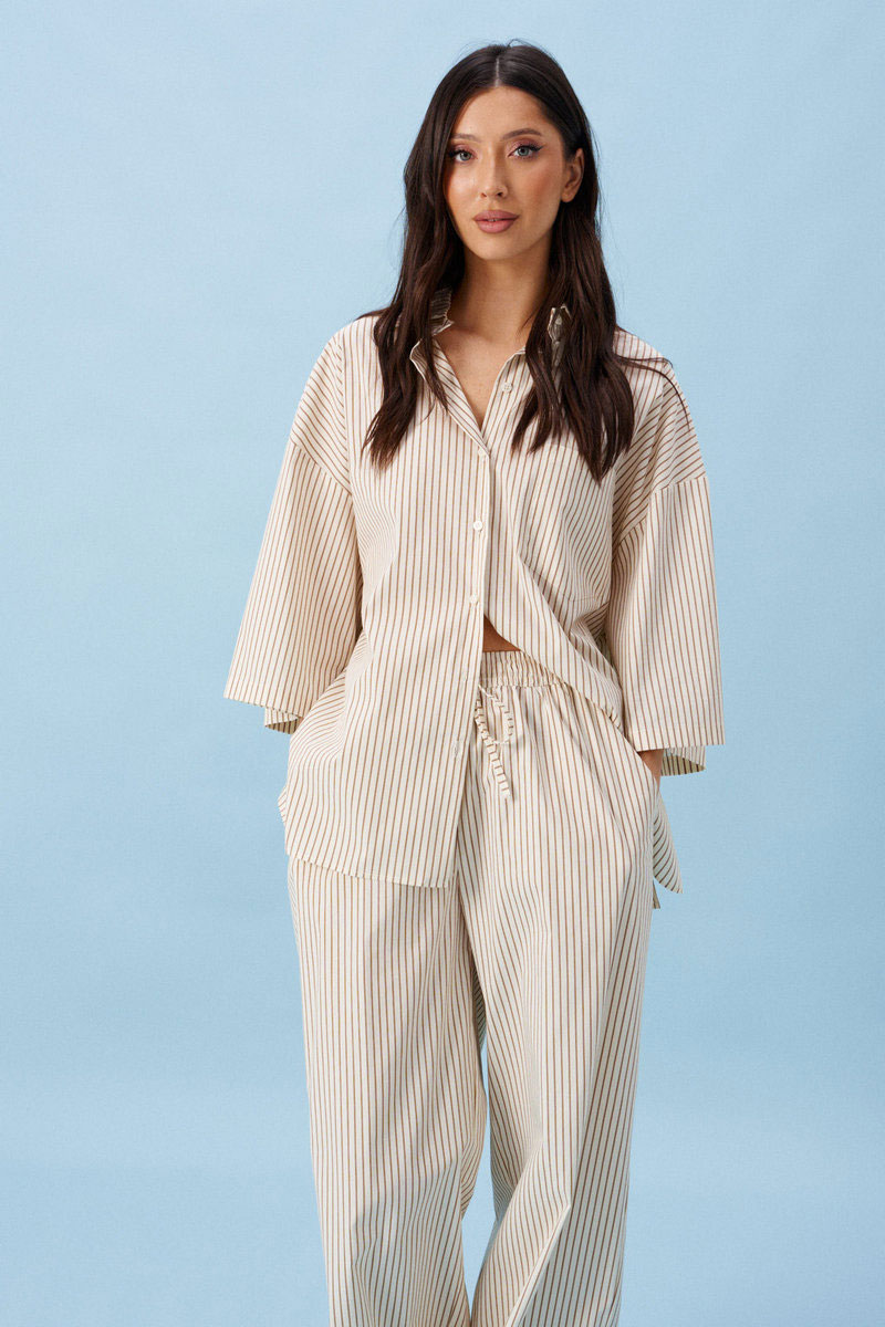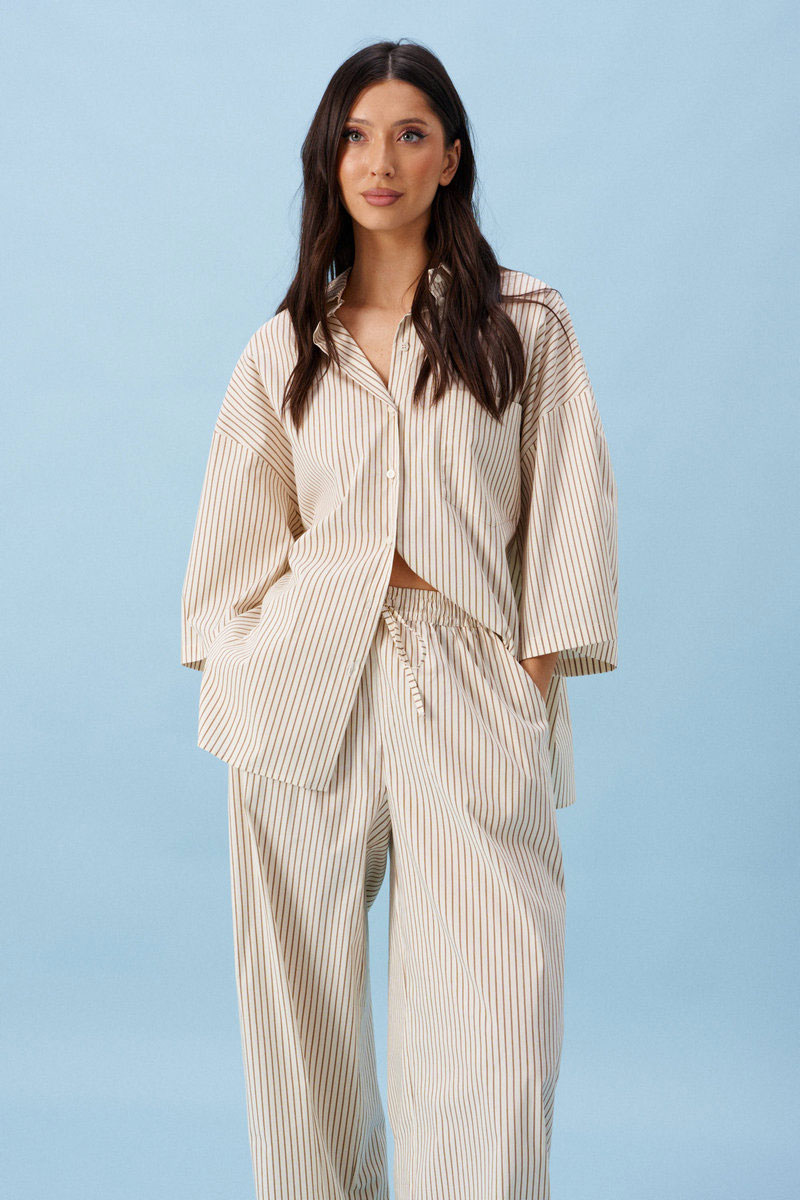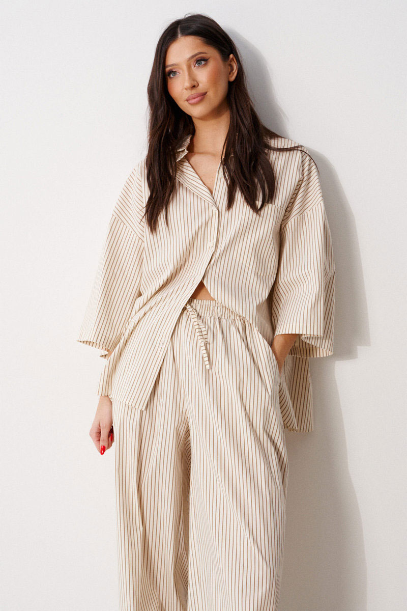 Брюки женские, длинные. прямого силуэта. Выполнены из легкой хлопковой ткани, молочного цвета в коричневую полоску. Характеристика: в боковых швах карманы с отрезными бочками. По задним половинам накладные фигурные каманы. Пояс отрезной, присборен на резинку. Имеет две отделочные строчки, образующие кулису, в которую через пробивные петли затянут шнур-завязка.