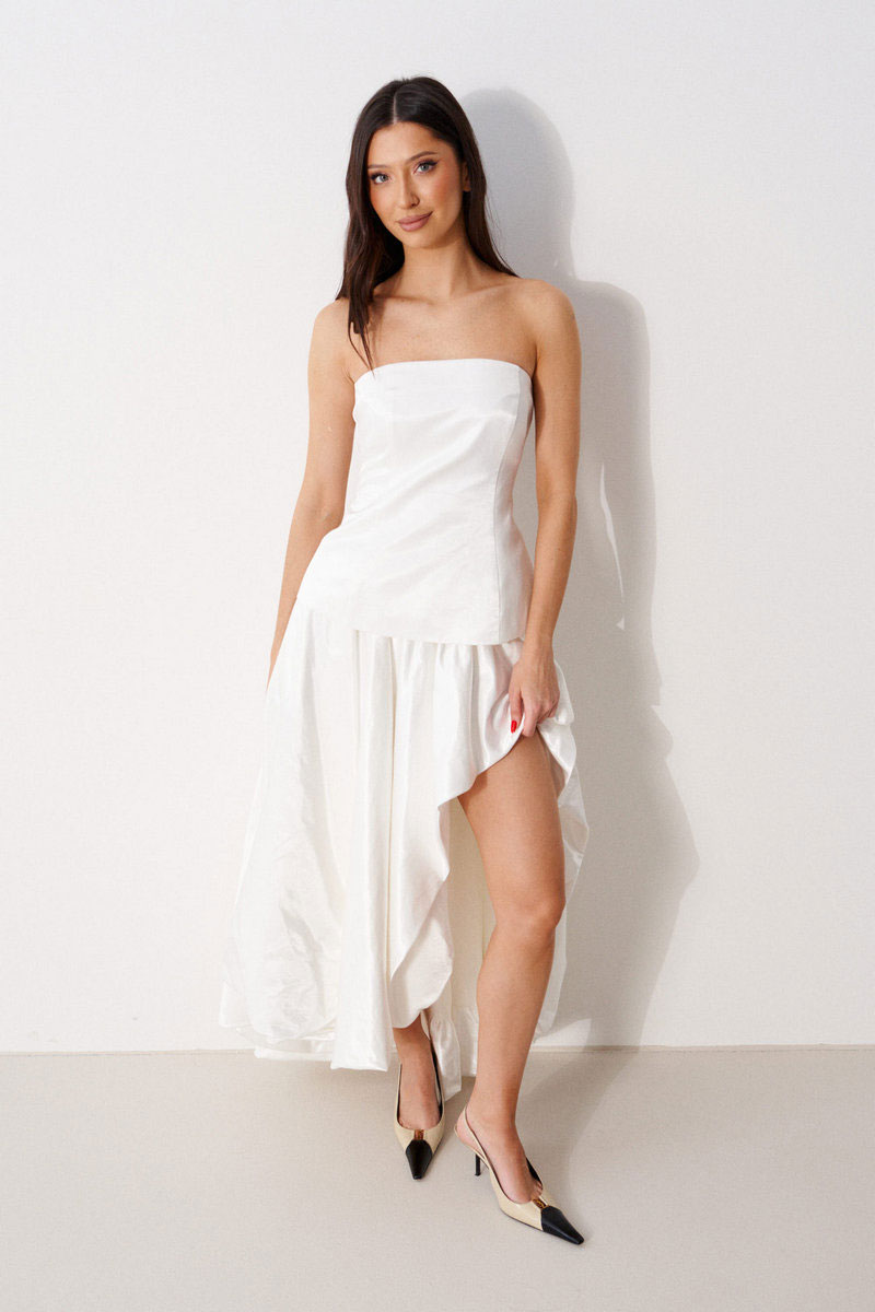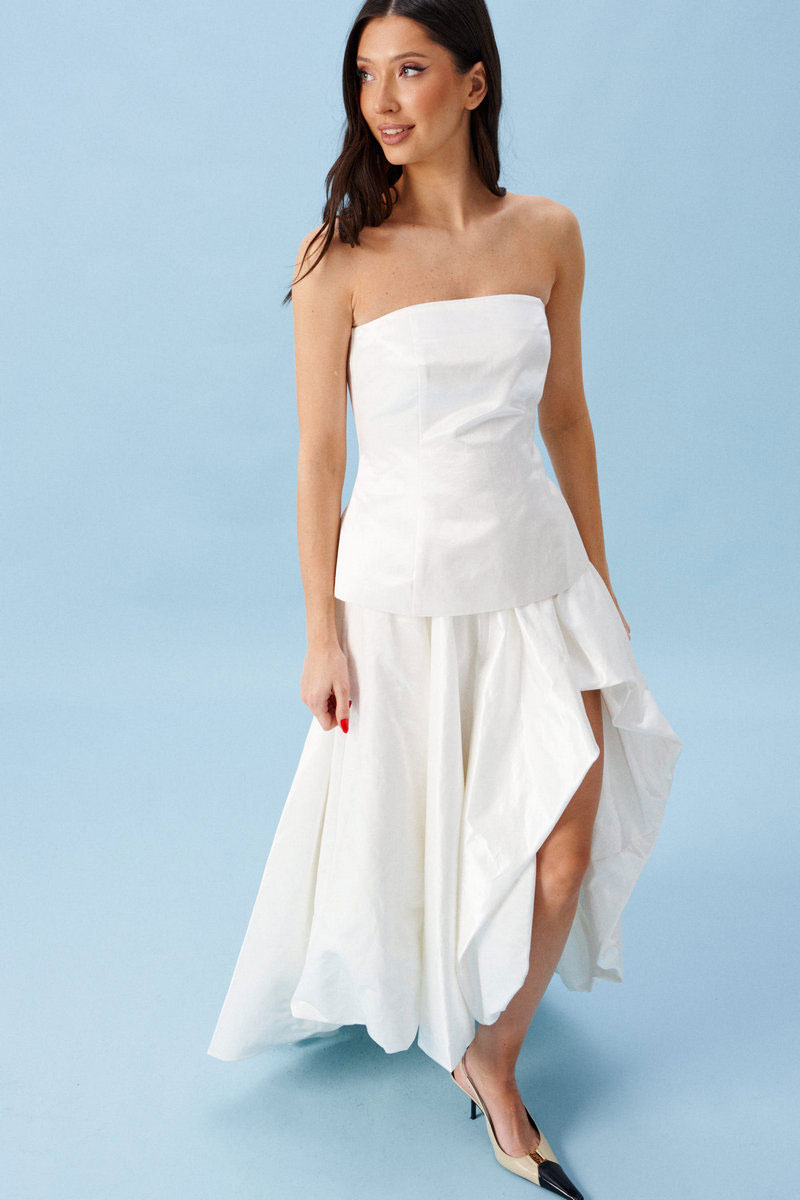 Юбка женская с фигурным низом, выполнена из плотного полотна белого цвета. Характеристика: фигурный низ с глубоким вырезом на левом бедре, пояс на резинке, в боковых швах карманы на подкладке, низ юбки на мягком подгибе.