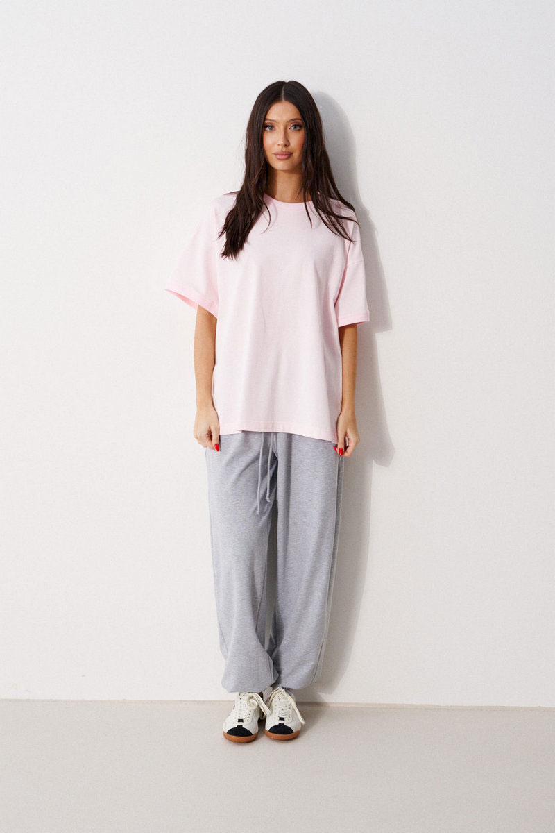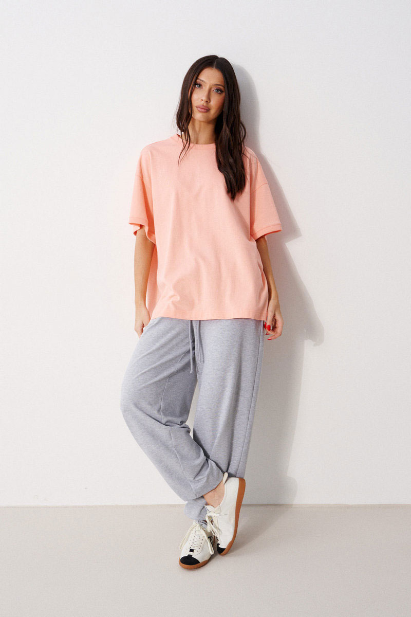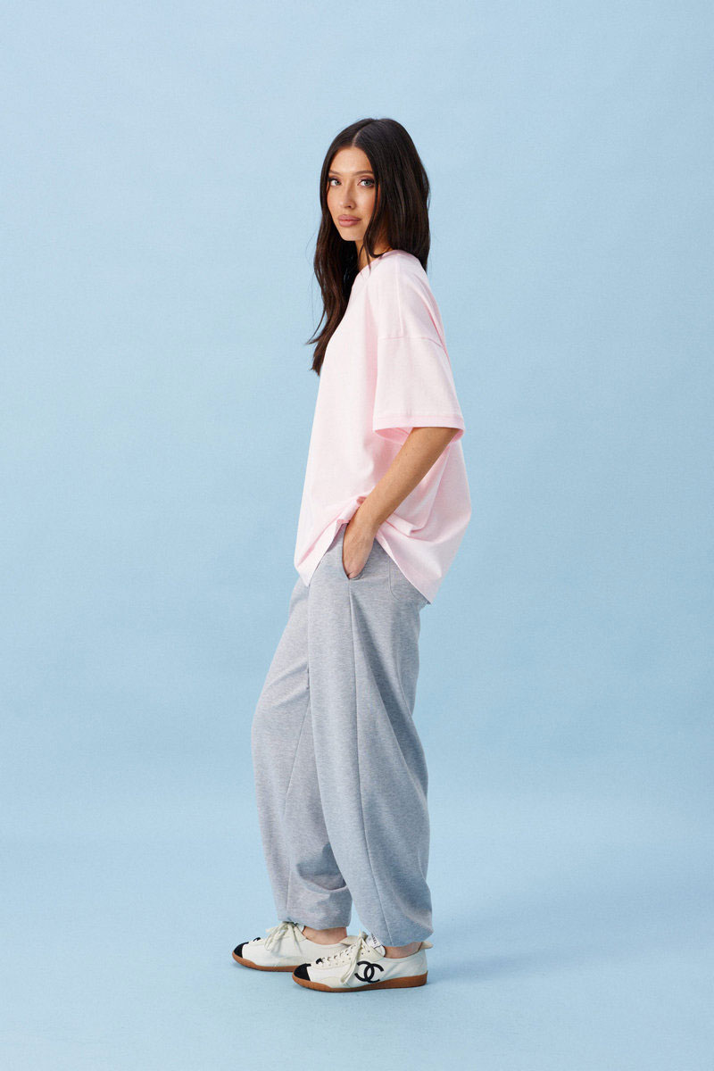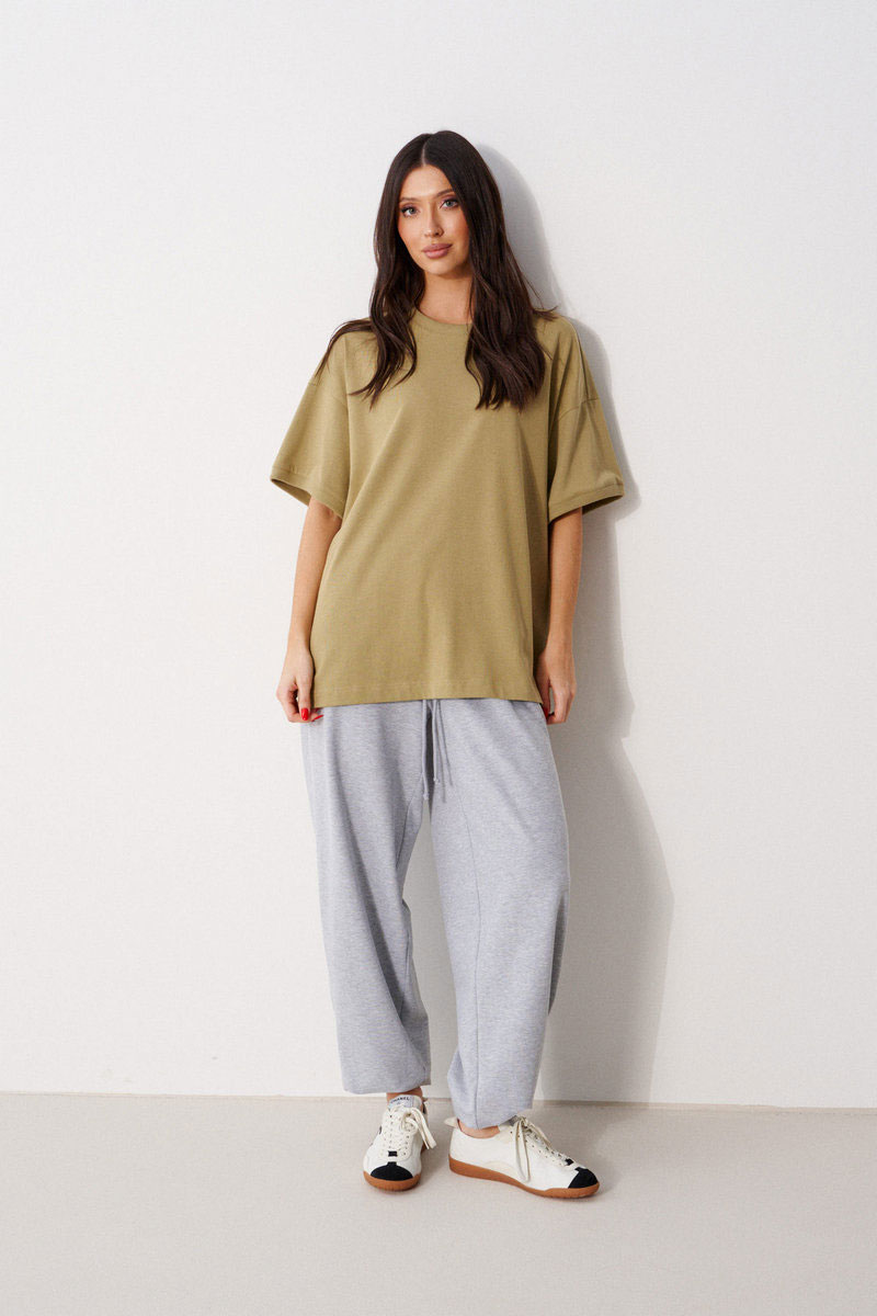 Брюки свободного кроя. Выполнены из хлопковой трикотажной ткани серого цвета. Пояс на резинке, со шнурочком-завязкой. В боковых швах карманы. По задней части накладные карманы. Низ брючины на резинке (не регулируется).
