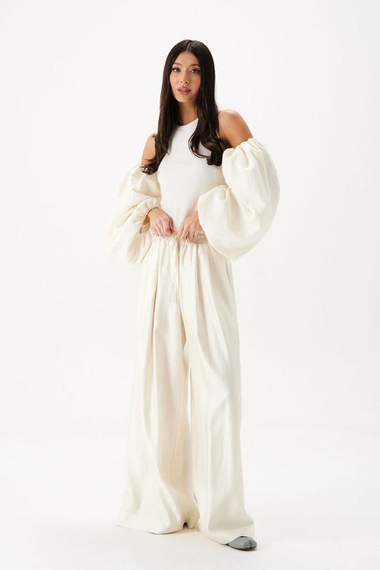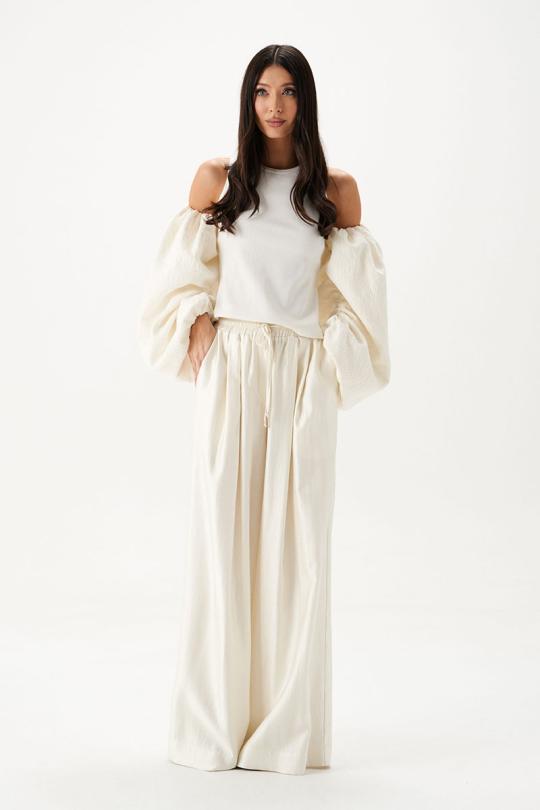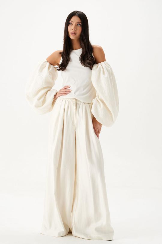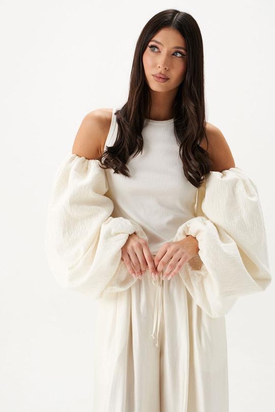 Топ прилегающего силуэта. Выполнен из трикотажного полотна белого цвета в комбинации с рукавами из двойного муслина молочного цвета. Горловина круглая. Рукава съёмные, внутренний шов со сборкой.