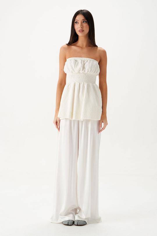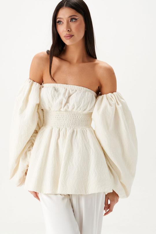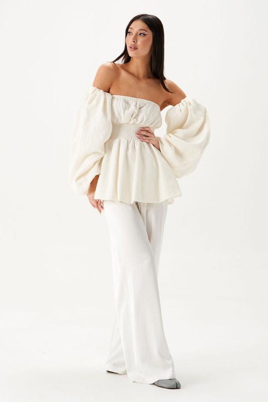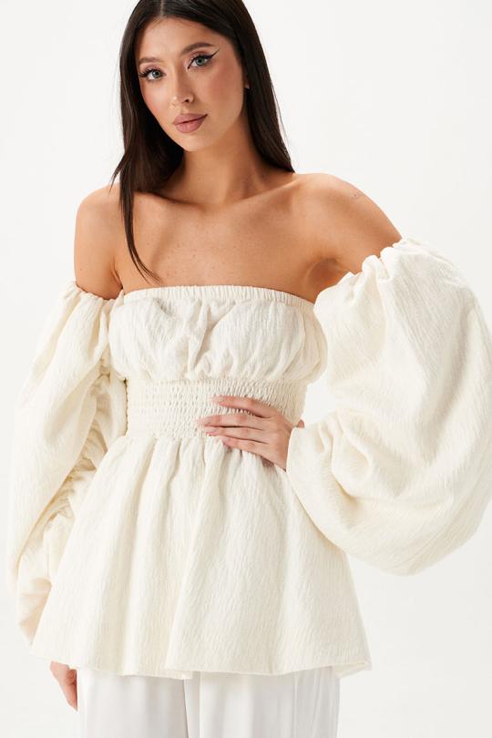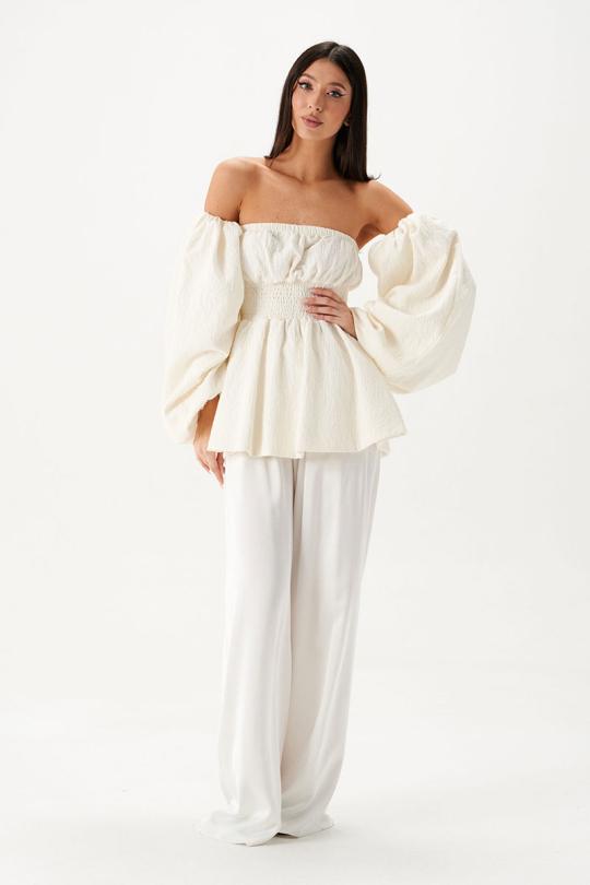 Блуза. Выполнена из двойного муслина молочного цвета. Верхняя часть на резинке. По линии талии широкая венгерка. Низ свободного кроя. Есть подкладка. Рукава-буфы не идут в комплекте.