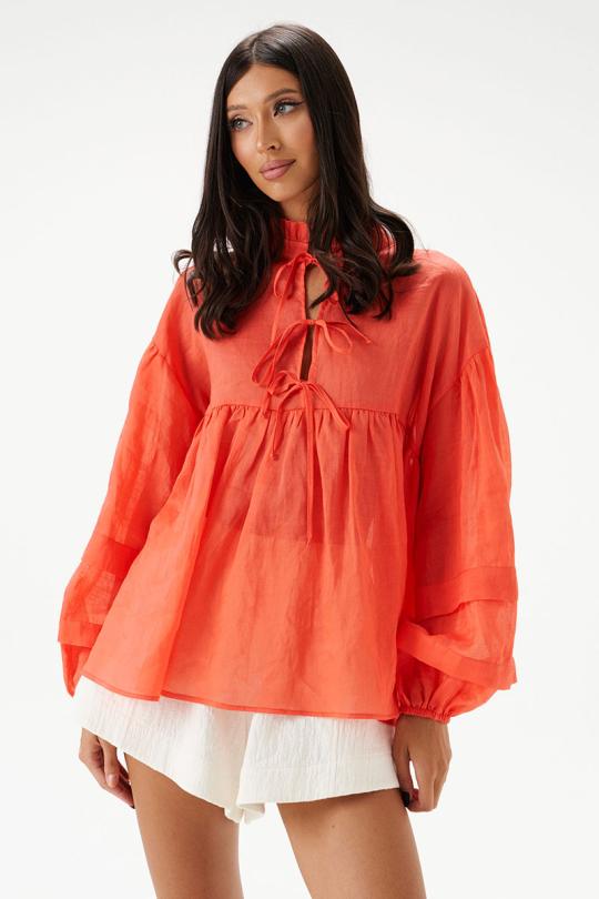 Блуза свободного кроя. Выполнена из легкого натурального полотна- рами . По переду и по задней части фигурная кокетка. По переду на кокетке тесьма-завязки (завязки функциональные). Рукав втачной, немного спущен. Низ рукава на резинкей.