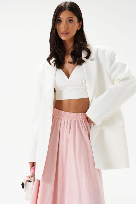 Топ на узких бретелях выполнен из белого полотна. Характеристики: укороченный, фигурный вырез горловины, узкие бретели, по спинке резинка со сборкой, по переду под лифом стабильная вставка, застежки в изделии нет.