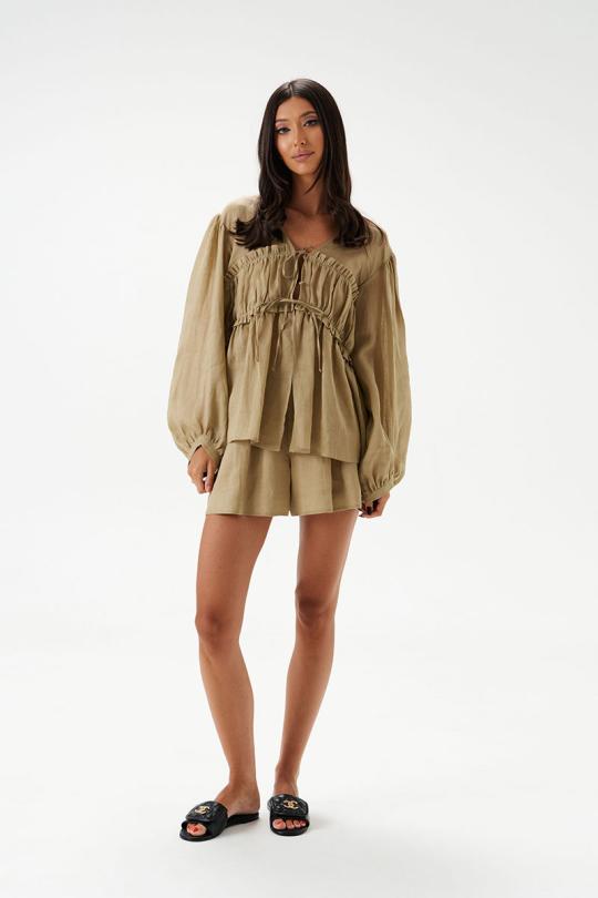 Блузка свободного кроя, выполнена из легкого натурального полотна. Прямой свободный крой, рукав широкий вточной, низ присборен на фигурную узкую манжету, V-образный вырез, лиф отрезной по линии талии, застежка центральная на шнурки-завязки.