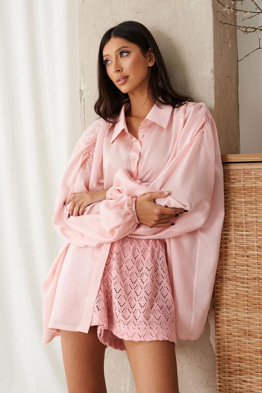 Рубашка свободного кроя, выполнена из полотна розового цвета. Воротник отложной на стойке. По плечевым швам сборка. Рукав втачной, со спущенной линией плеча, низ рукава на резинке. Спинка цельная. Застежка центральная пуговицы. Низ прямой.