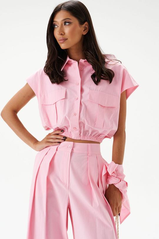 Блузка укороченная, без рукавов, выполнена из хлопкового полотна нежно-розового цвета. Характеристики: воротник рубашечного типа, застежка на пуговицы, по переду накладные карманы с клапонами, низ присборен на резинку. В комплект прилагается шарф из основной ткани изделия.