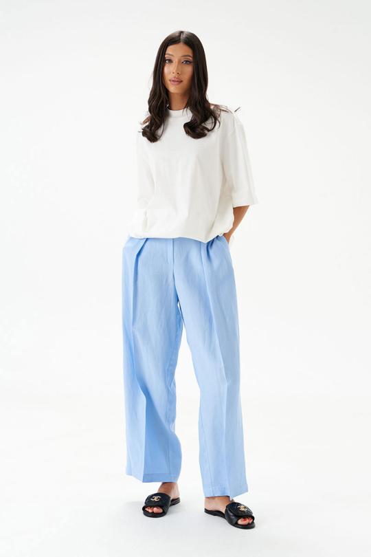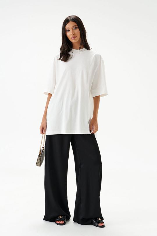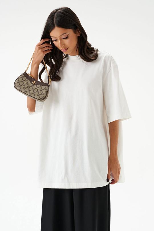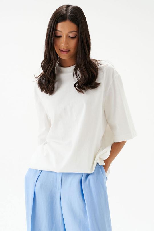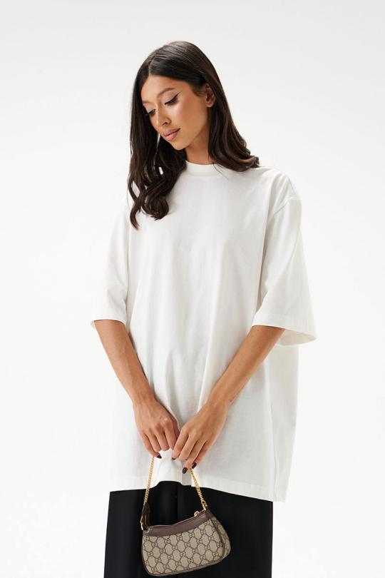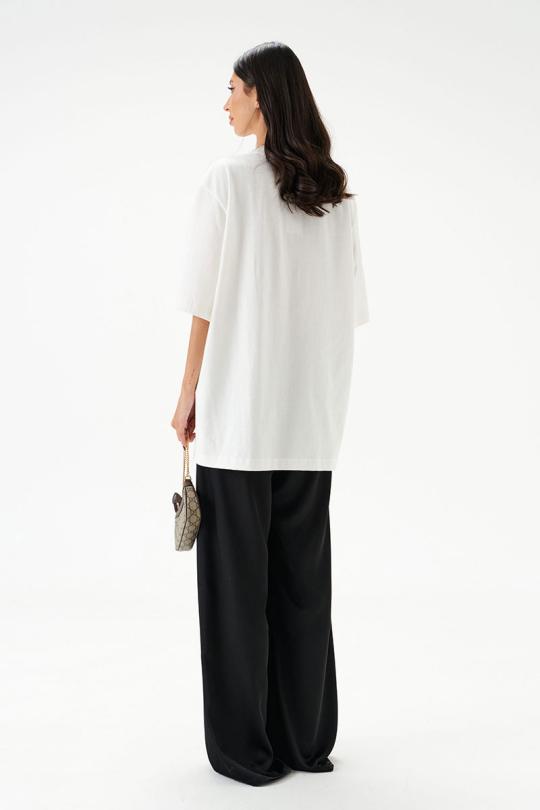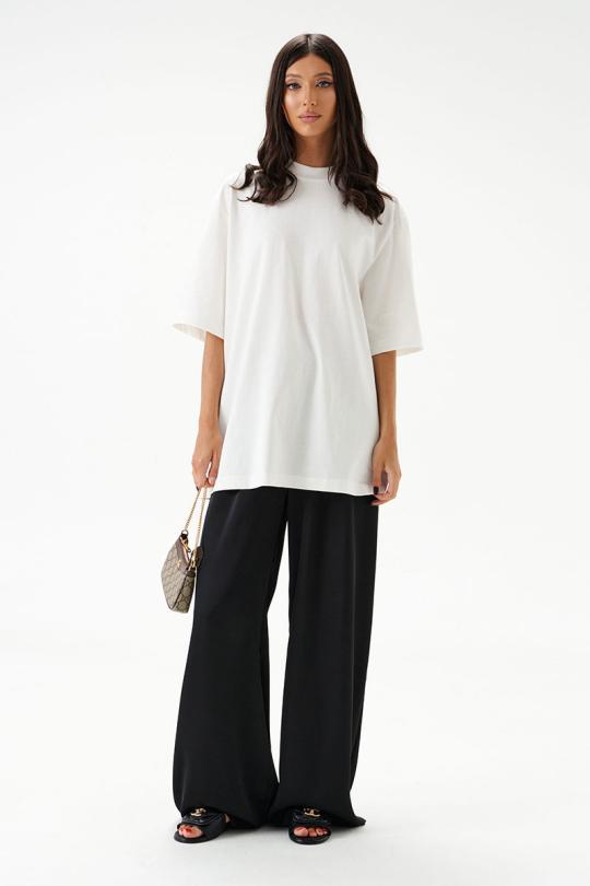 Футболка прямого свободного кроя. Выполнена из хлопкового полотна тёплого белого цвета. Вырез горловины круглый. Рукав втачной, спущенный.