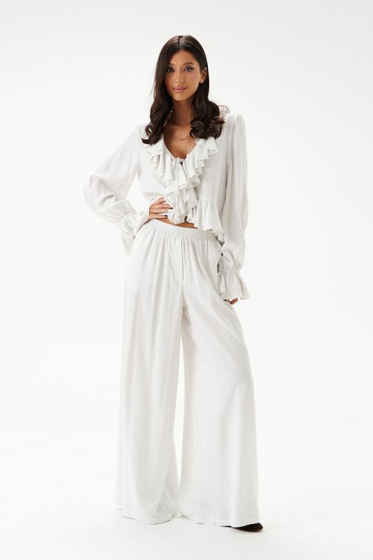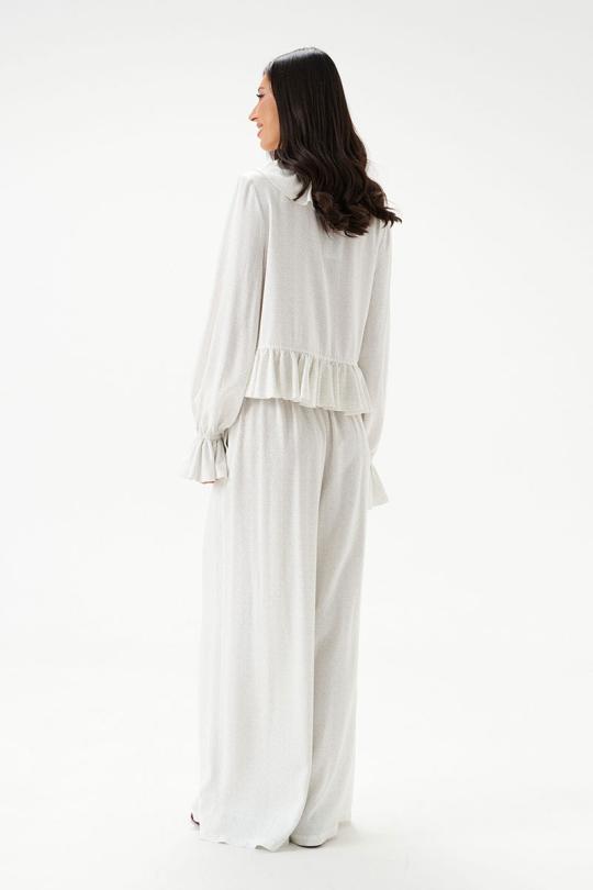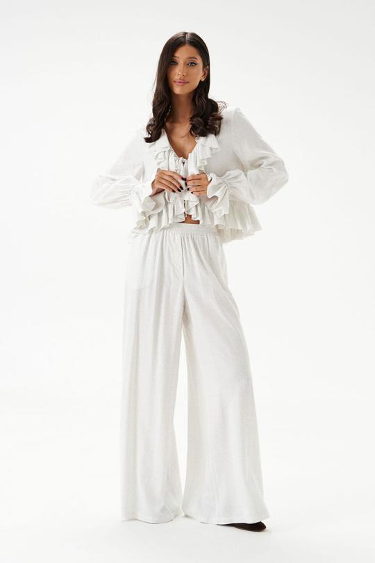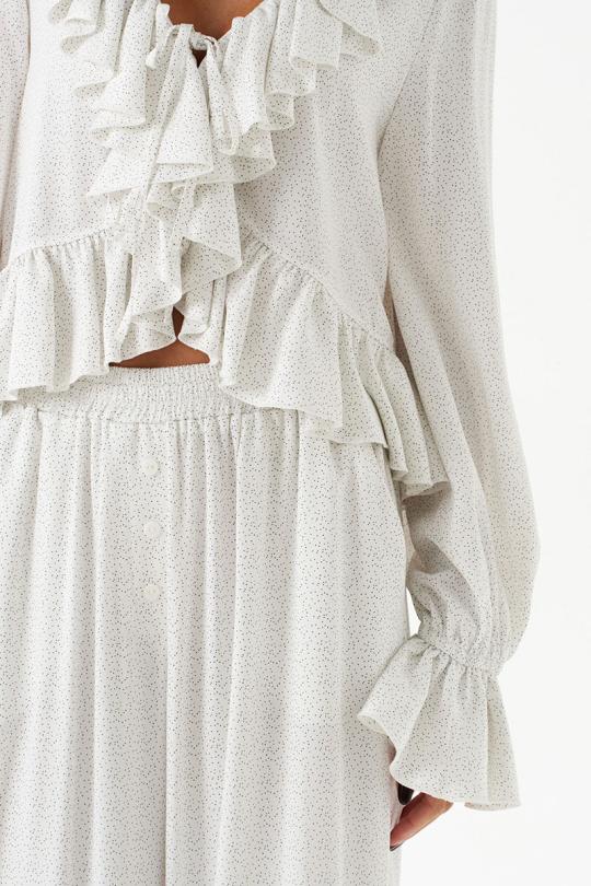 Блузка из текстильного полотна белого цвета в мелкий горошек, свободного облегания, укороченная.Горловина V-образная, с притачной рюшей по всей длине горловины, борта и низа. Застежка на шнурки- завязки. Рукав одношовный, длинный заканчивающийся притачной манжетой в виде волана.