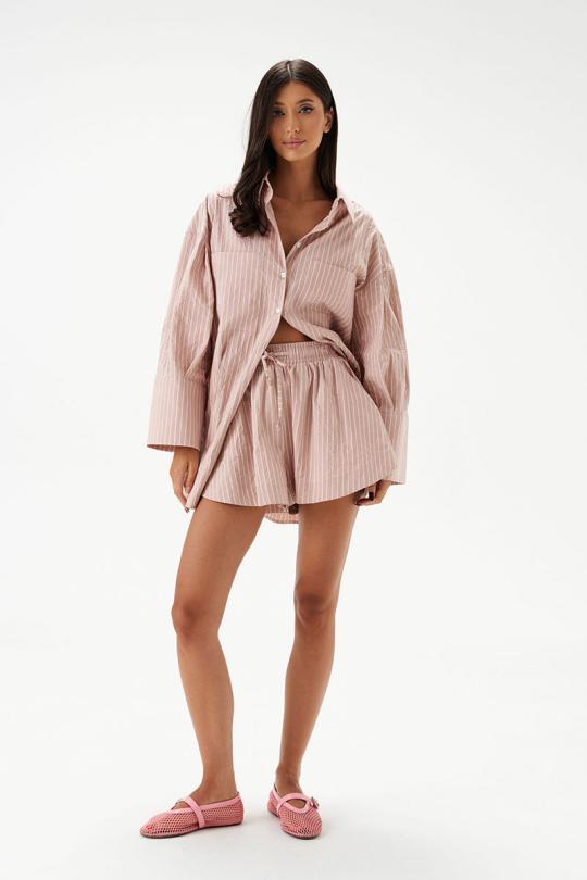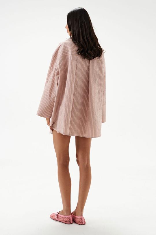 Рубашка прямого свободного кроя выполнена из текстильного полотная песочного цвета в розовую полоску. Характеристики: прямой свободный крой, отложной воротник на стойке, застежка центральная на петли пуговицы, по переду крупные карманы, рукав спущен, по рукаву декоративные складки, по низу рукава широкая манжета, спинка отрезная с декоративными складками, низ изделия с плавным срезом.