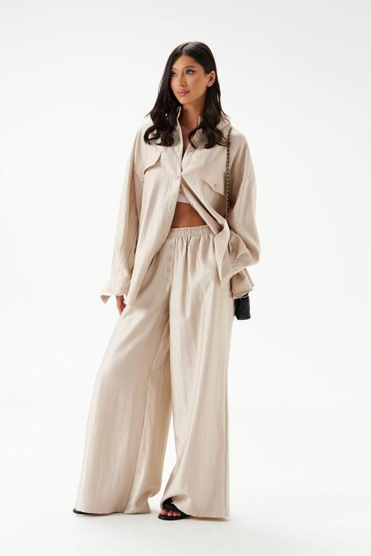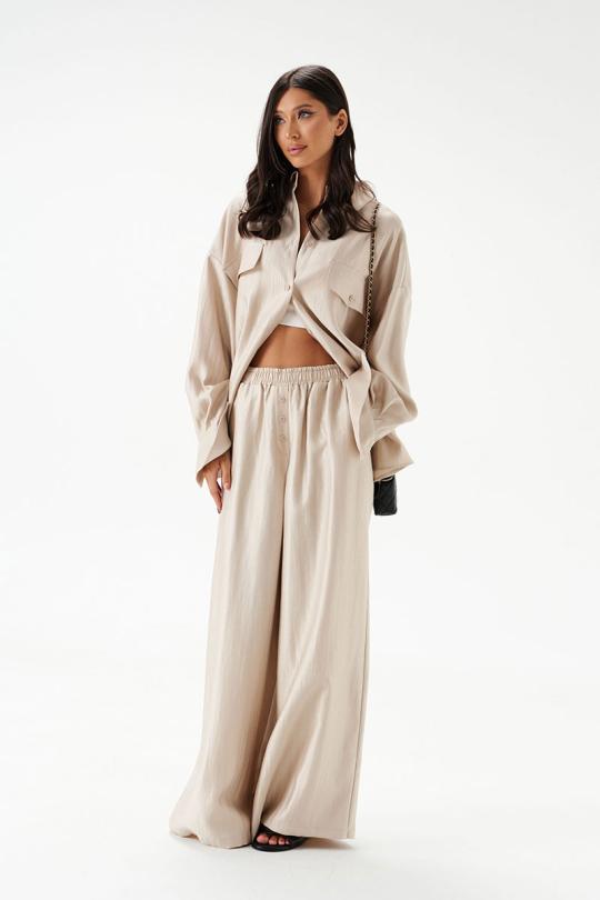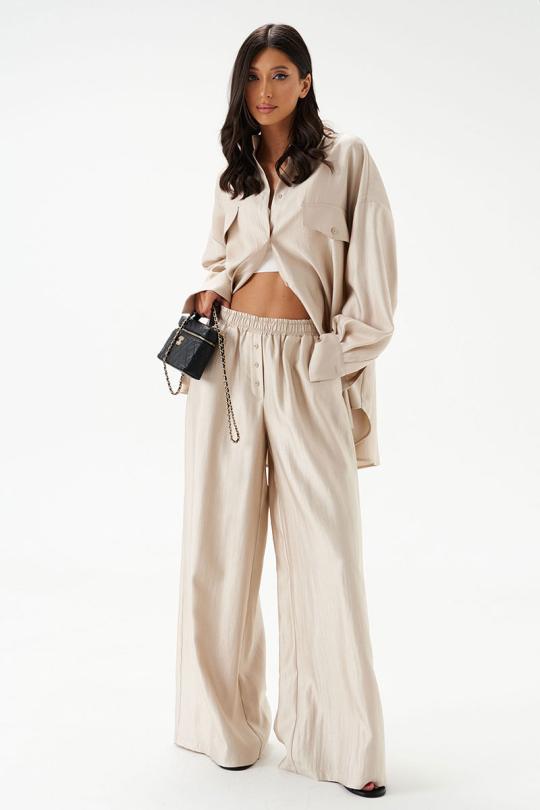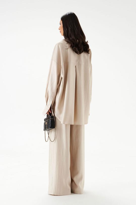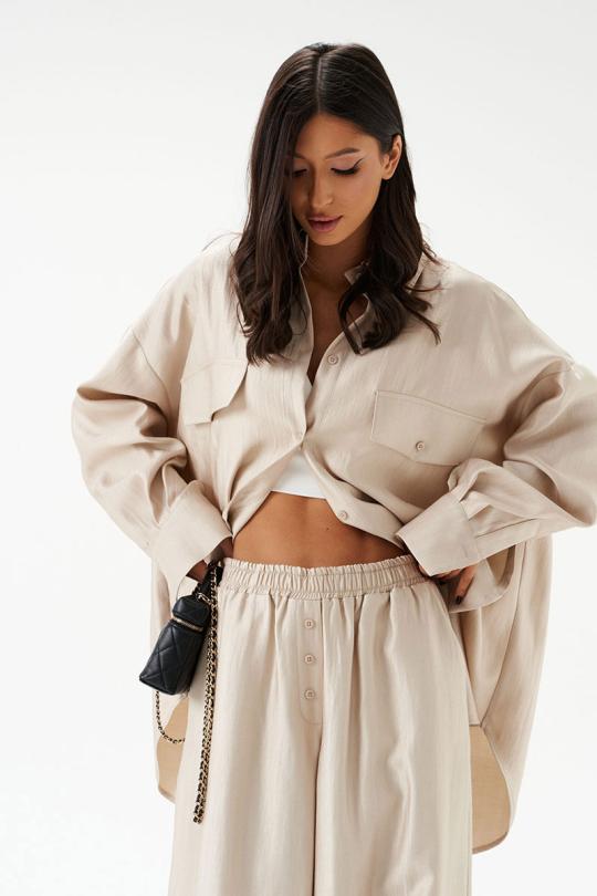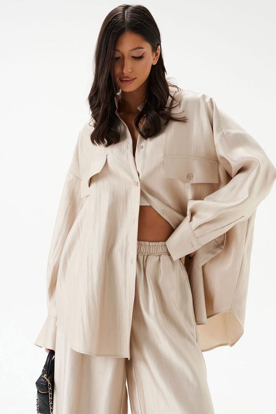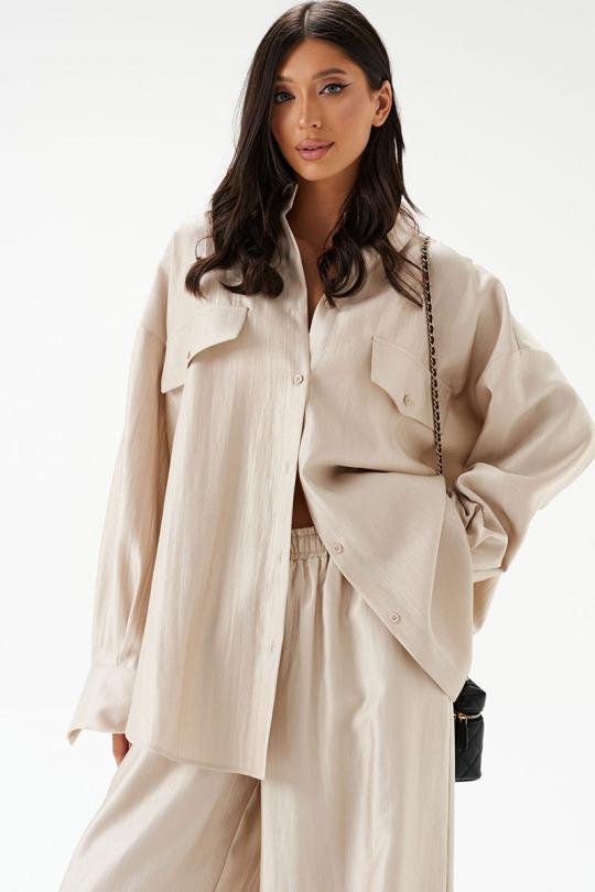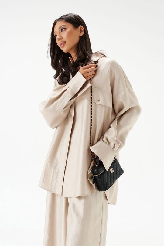 Блузка прямого, свободного кроя. Выполнена из мягкого текстильного полотна, с напылением блеска. Воротник отложной. Застёжка центральная на пуговицы. По переду на уровни линии груди клапаны - имитация карманов. Рукав спущенный, свободный, с манжетой на пуговице. Спинка отрезная со сборкой.