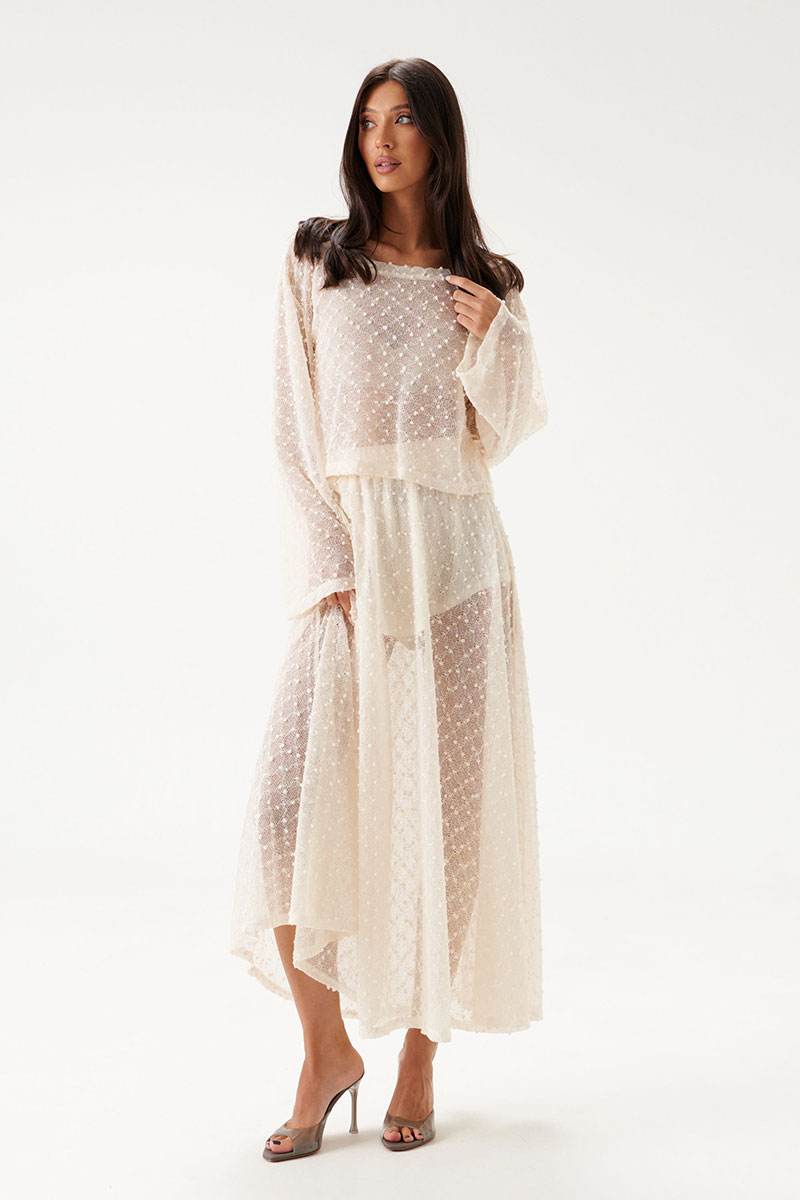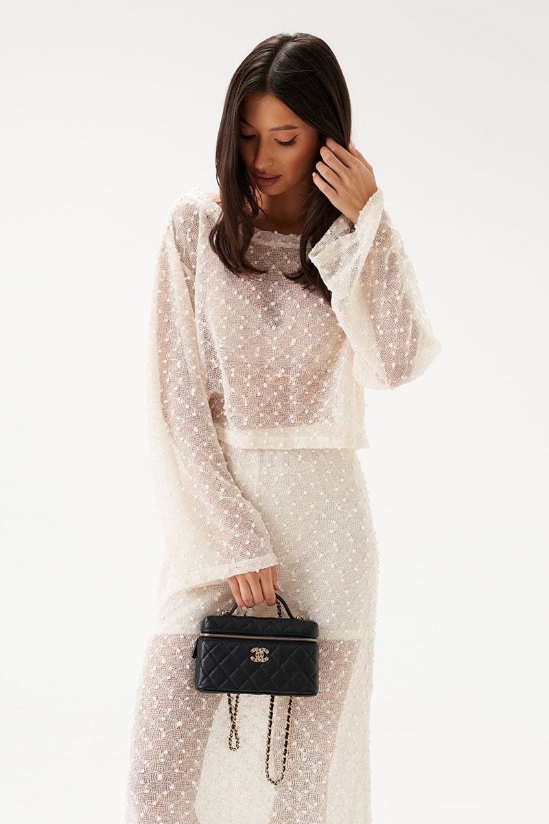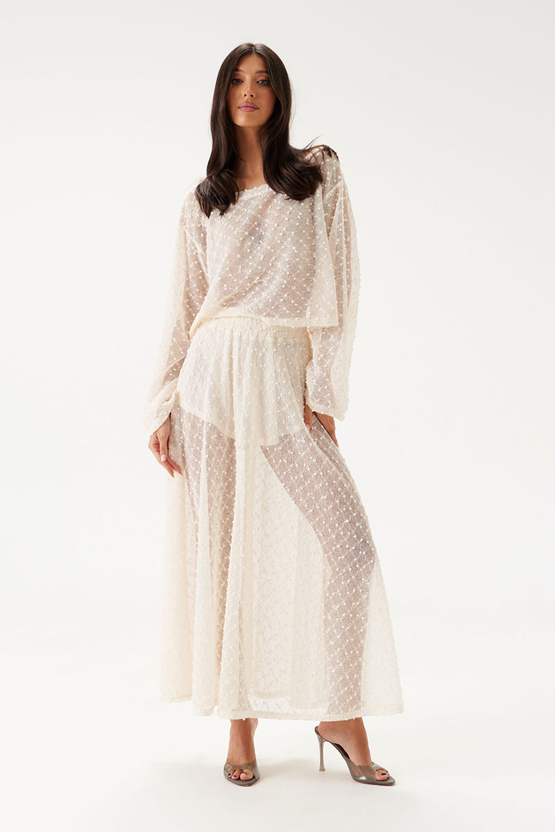 Джемпер свободного кроя. Выполнен из кружева молочного оттенка. Круглый широкий вырез горловины. Рукав втачной, немного спущен.