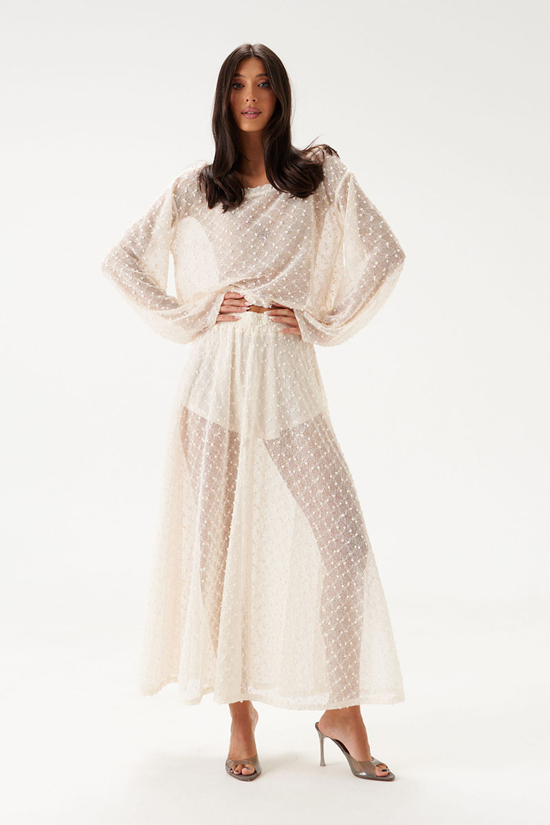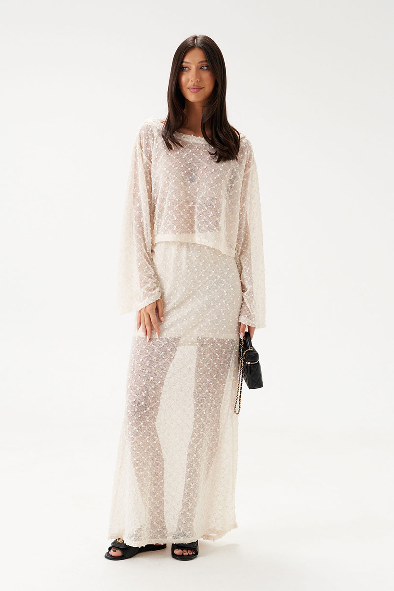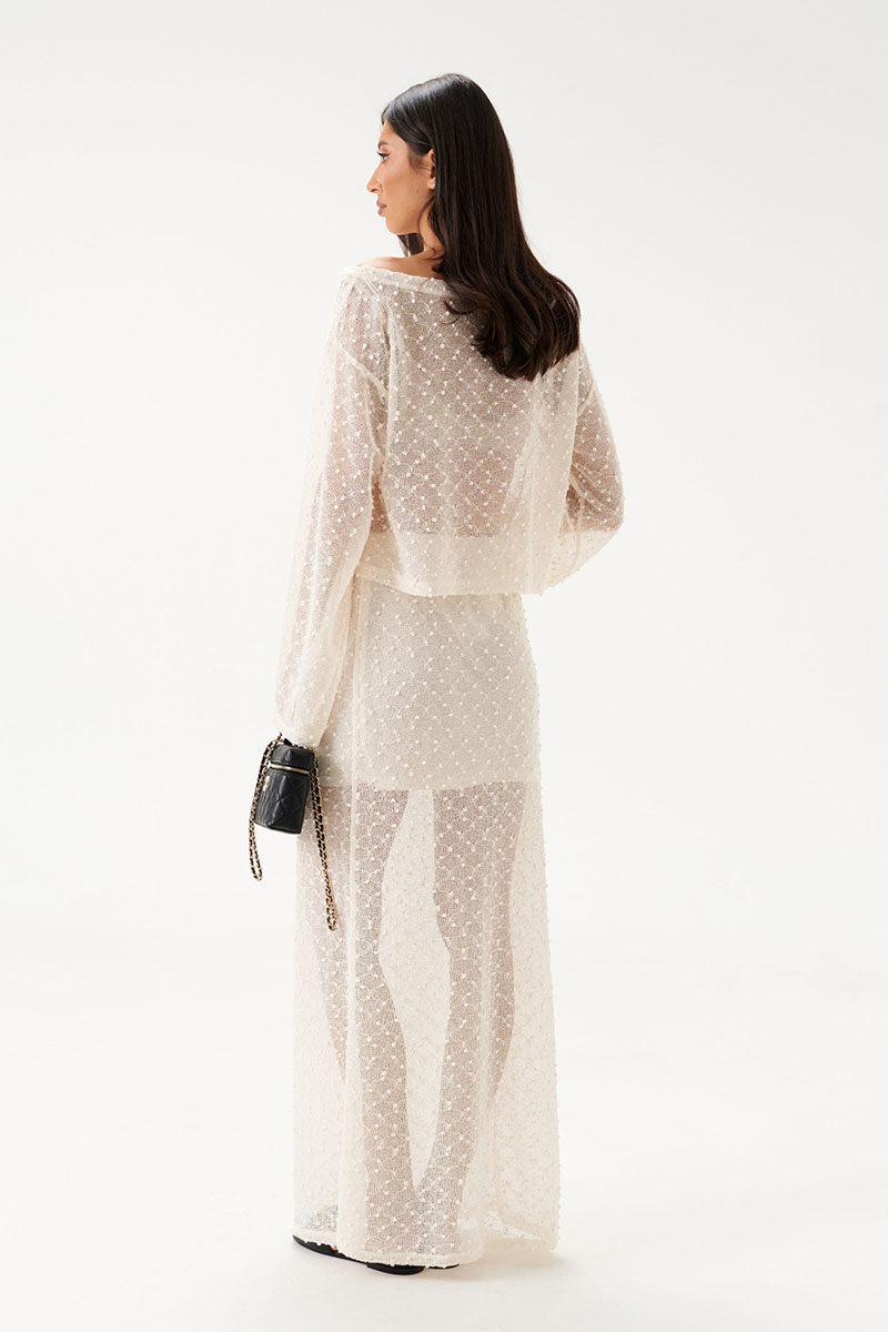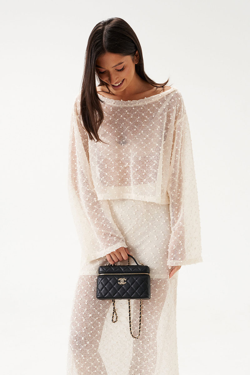 Джемпер свободного кроя. Выполнен из кружева молочного оттенка. Круглый широкий вырез горловины. Рукав втачной, немного спущен.