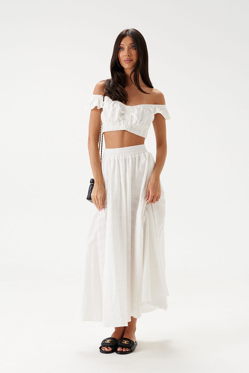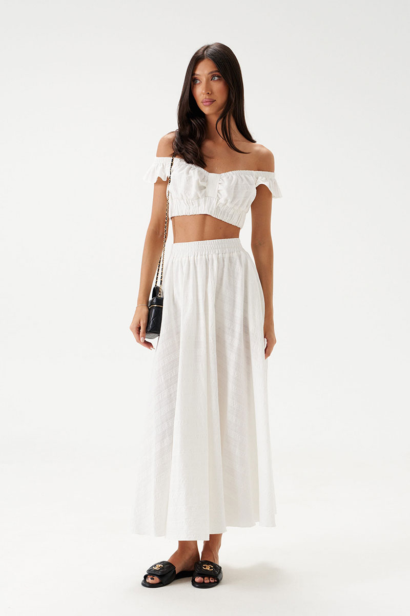 Укороченный топ, выполнен из ажурного полотна теплого белого цвета. Характеристики: фигурный вырез горловины, по переду и по спинке лифа резинка со сборкой, бретели с резинками и декоративным элементов в виде рюш, застёжки нет, низ изделия на широкой резинке.