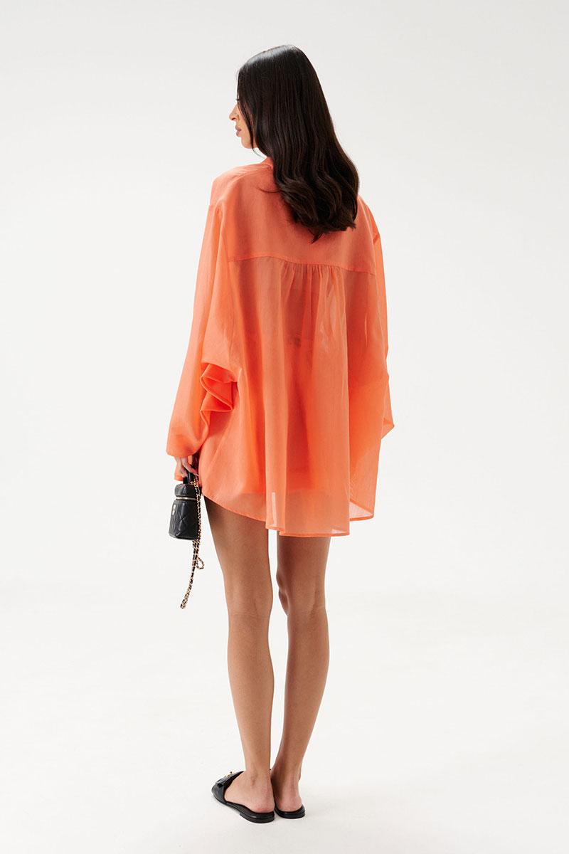Рубашка свободного кроя. Выполнена из мягкого полупрозрачного полотна оранжевого цвета. Горловина – стойка. Рукав втачной, широкий, «летучая мышь», к низу сужается. Спинка отрезная с кокеткой, со сборкой. Застёжка центральная - пуговички.