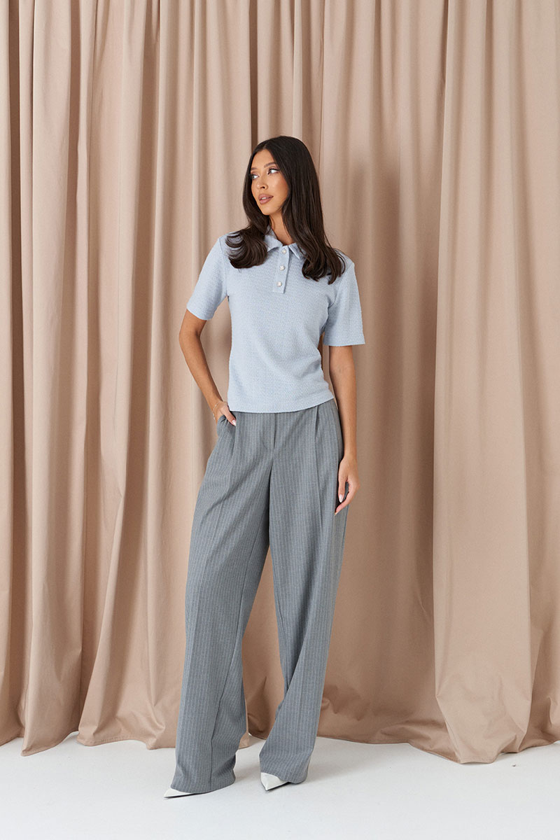 Джемпер-поло прямого кроя. Выполнен из фактурного трикотажа голубого цвета. Воротник отложной. Застёжка пуговички на планке. Рукав втачной, короткий.