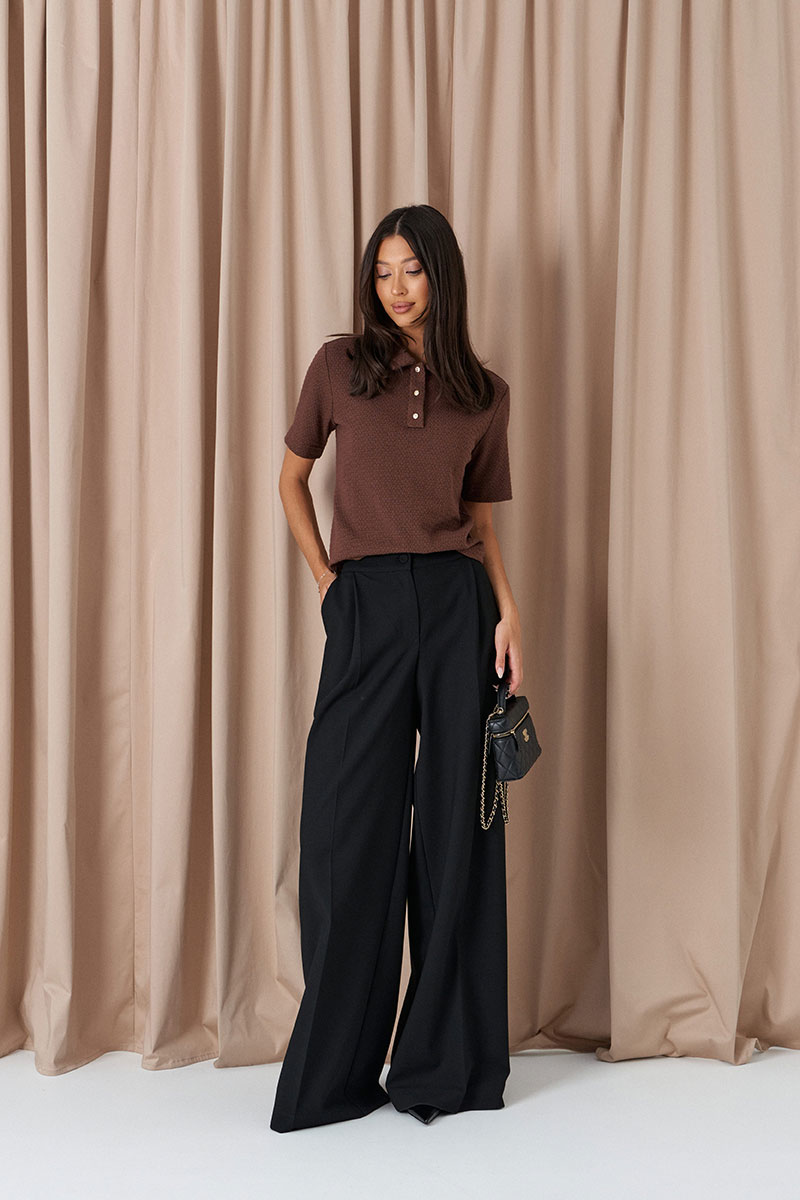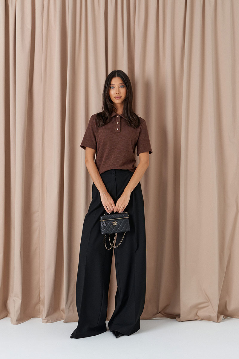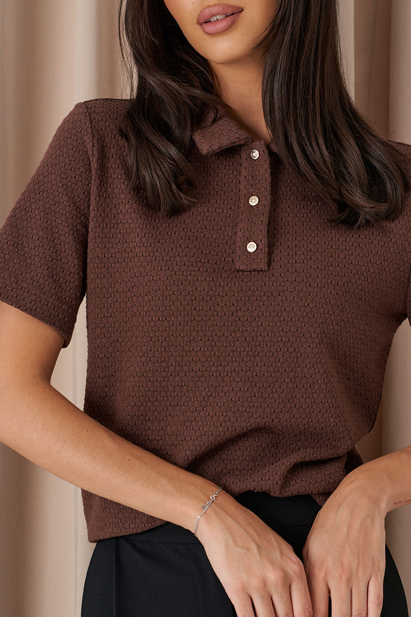 Джемпер-поло прямого кроя. Выполнен из фактурного трикотажа шоколадного цвета. Воротник отложной. Застёжка пуговички на планке. Рукав втачной, короткий.