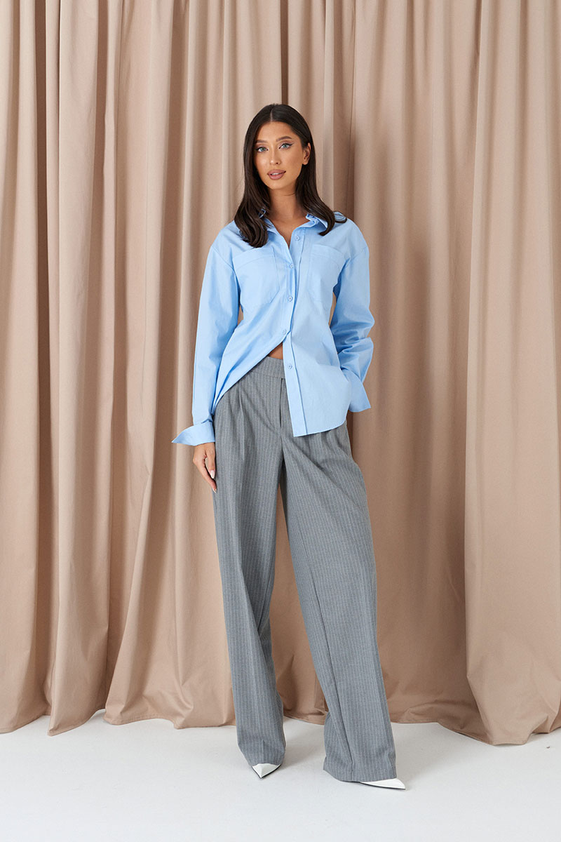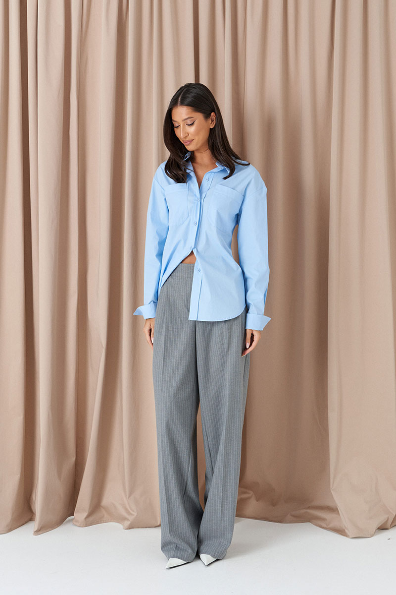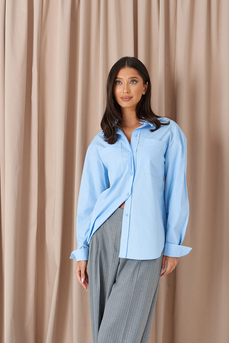 Блузка прямого кроя выполнена из хлопкового полотна голубого цвета. Характеристики: прямой крой, отложной воротник, застежка центральная на петли пуговицы, функциональные карманы по передней части изделия, втачной рукав, по низу рукава манжета на пуговицах, спинка отрезная с двумя рельефами, идущими из-под кокетки до низа, низ изделия с плавным срезом.