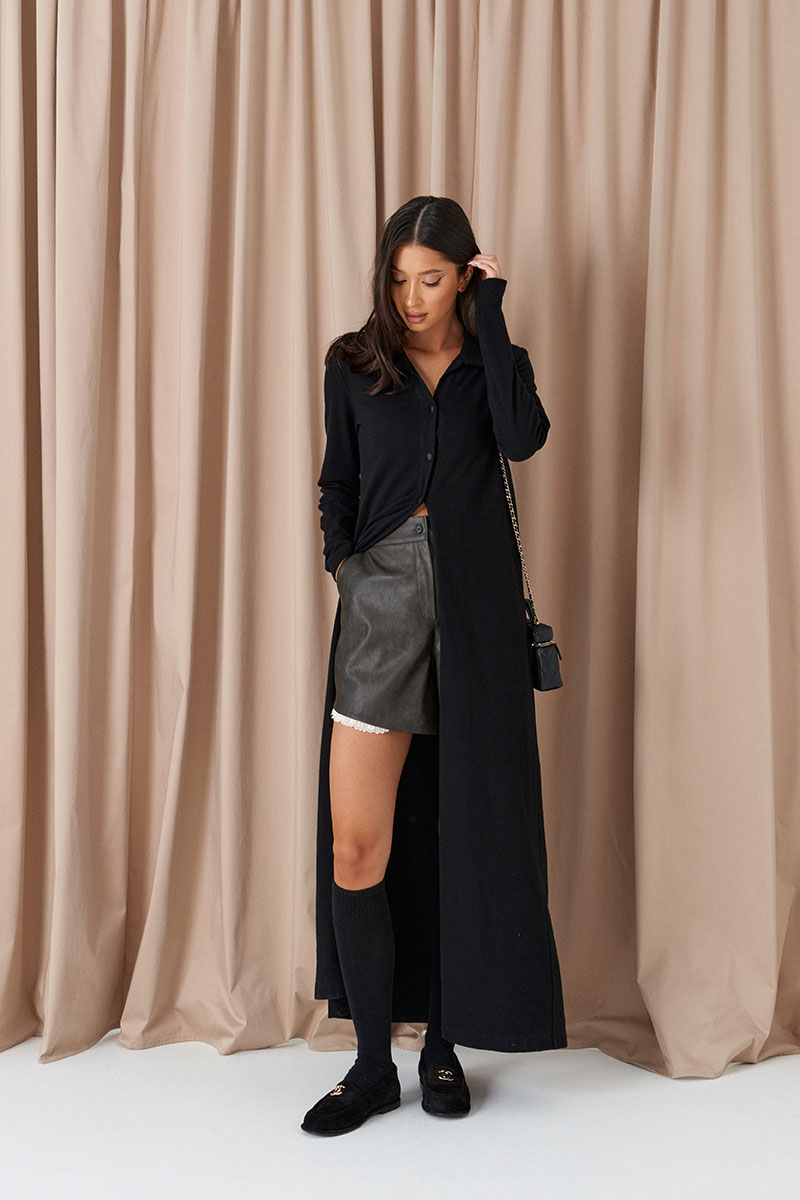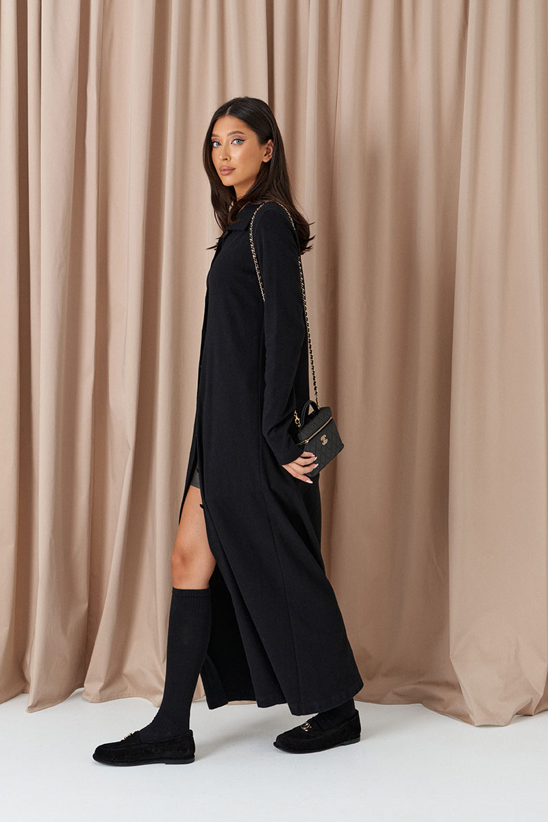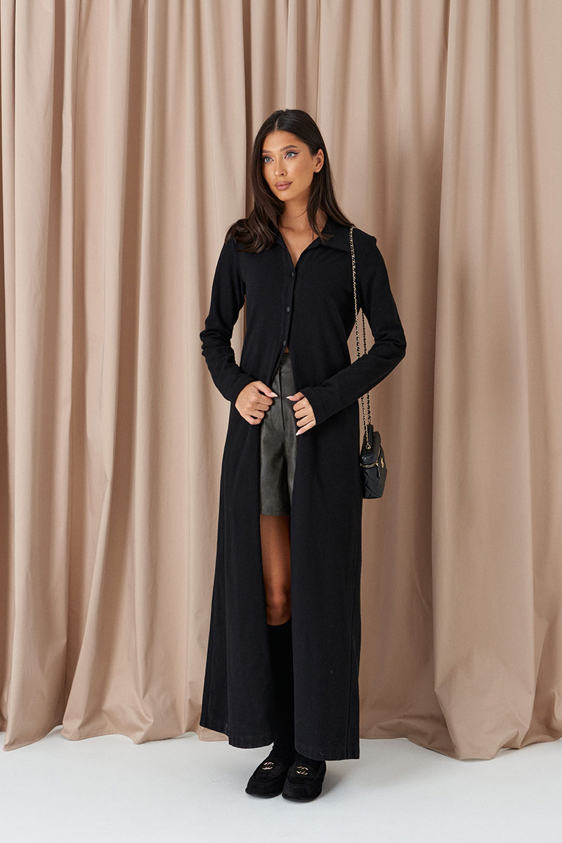 Джемпер удлиненный свободного кроя, выполнен из трикотажа черного цвета. Характеристика: свободный крой, расширение к низу, отложной воротник, застежка центральная на пуговицы, цельнокройная спинка, рукав вточной.