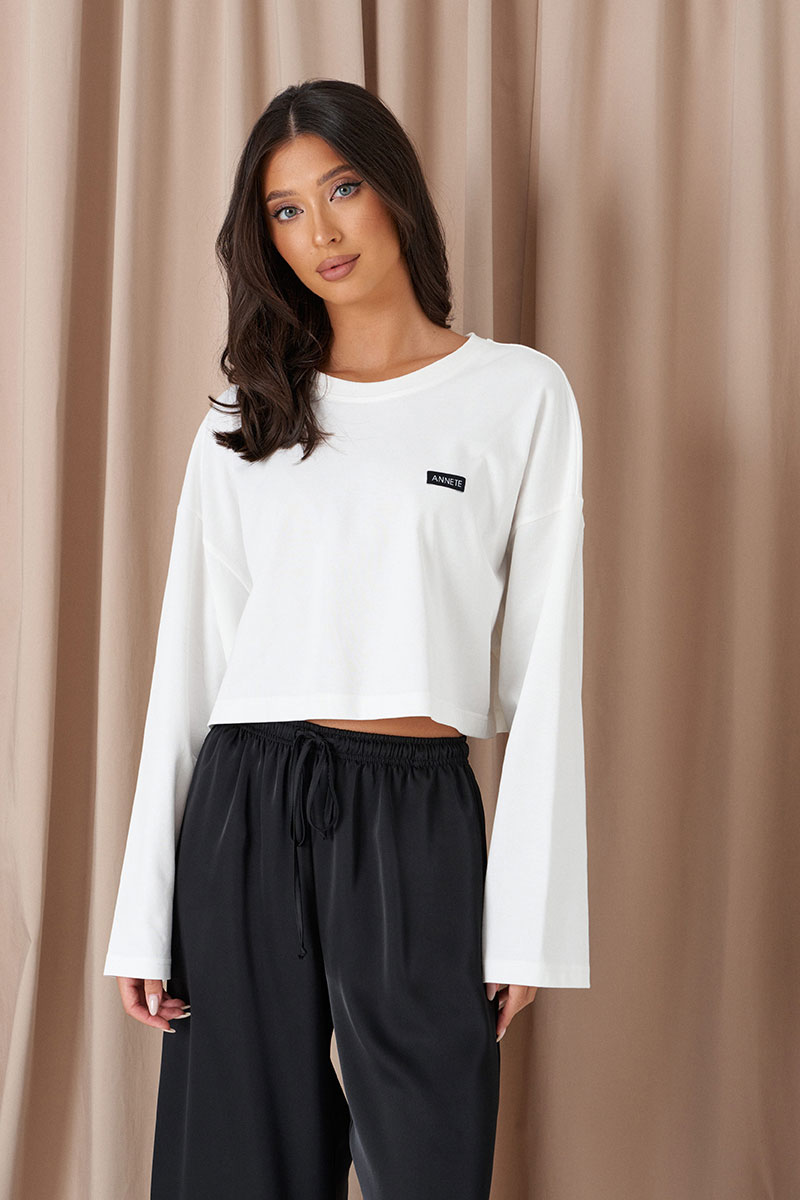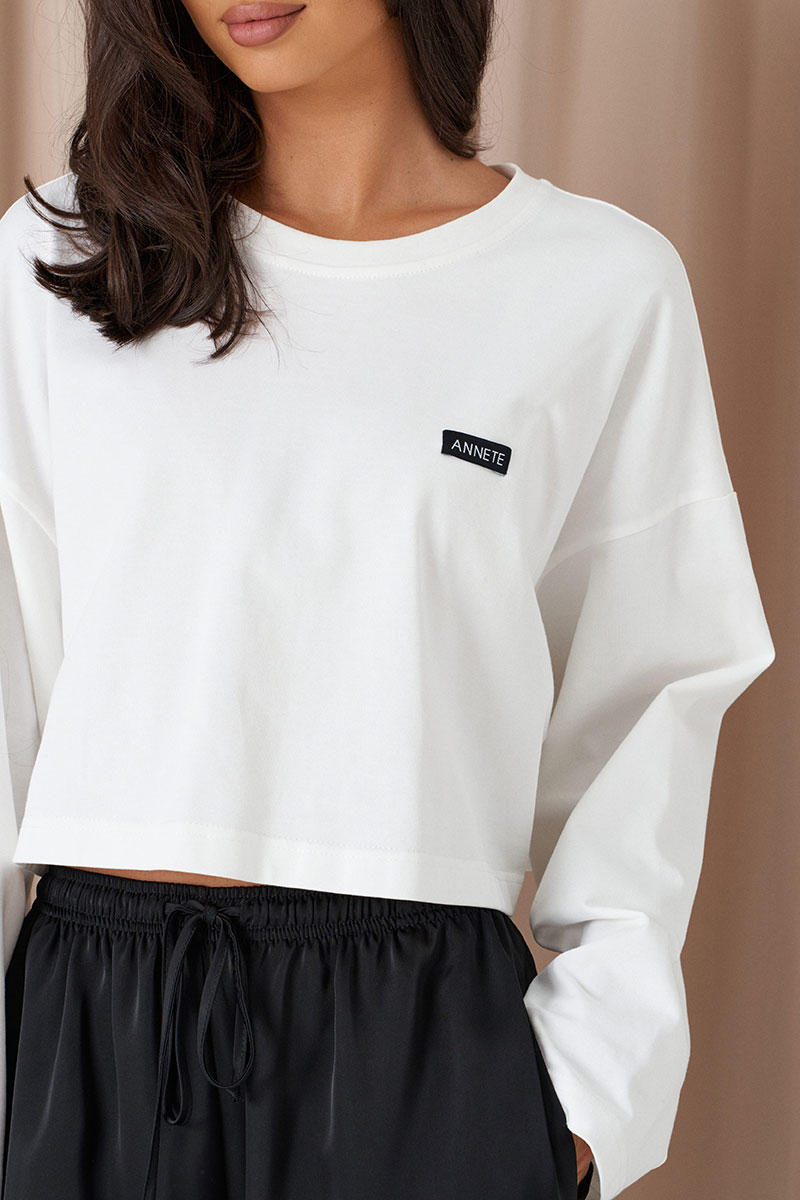 Джемпер прямого свободного кроя, выполнен из трикотажного полотна белого цвета. Характеристики: прямой крой, овальный вырез горловины, спинка цельнокроеная, по переду брендированная нашивка, рукав спущен.
