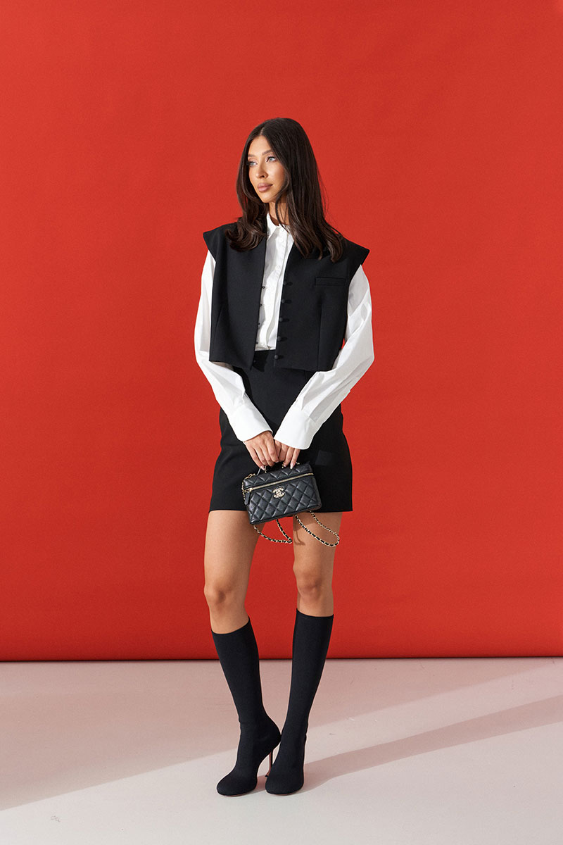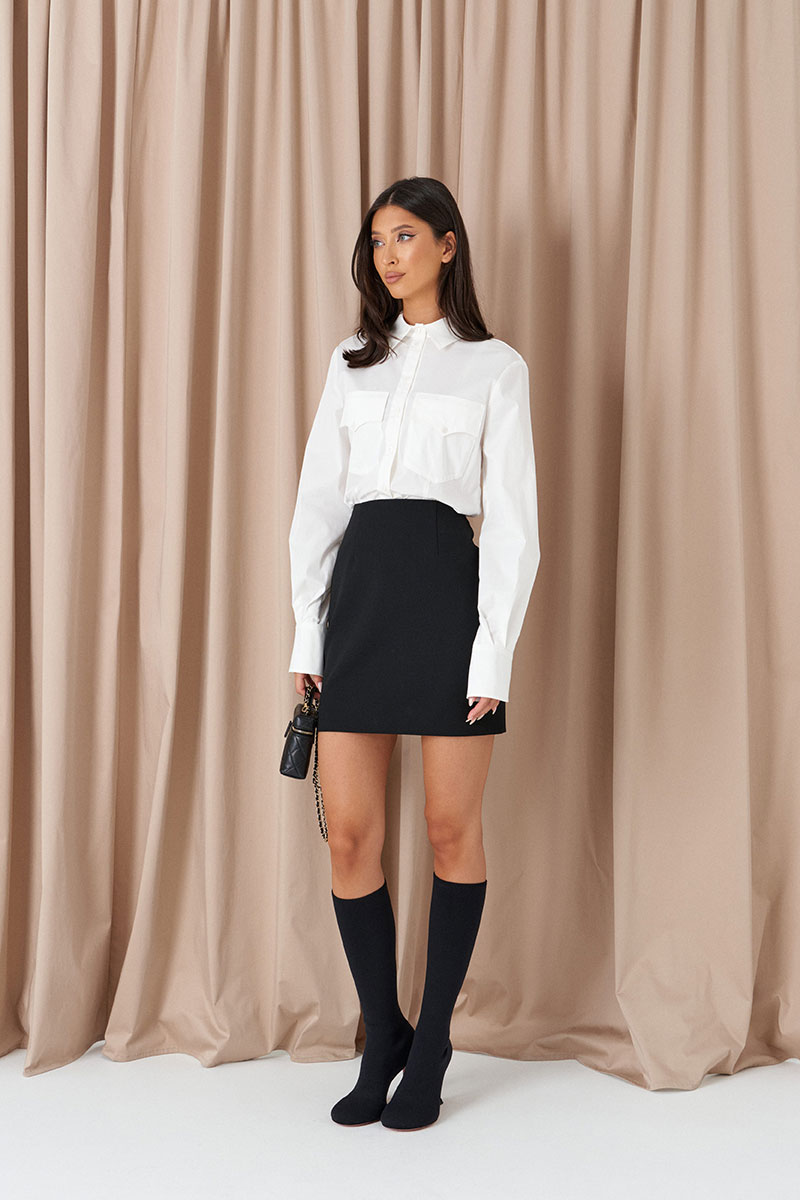Рубашка полуприлегающего силуэта, выполнена ткани белого цвета. Воротник отложной. Рукав втачной, с манжетой с пуговицами. Застёжка центральная - пуговицы. По переду на уровне груди накладные карманы с фигурным клапаном.