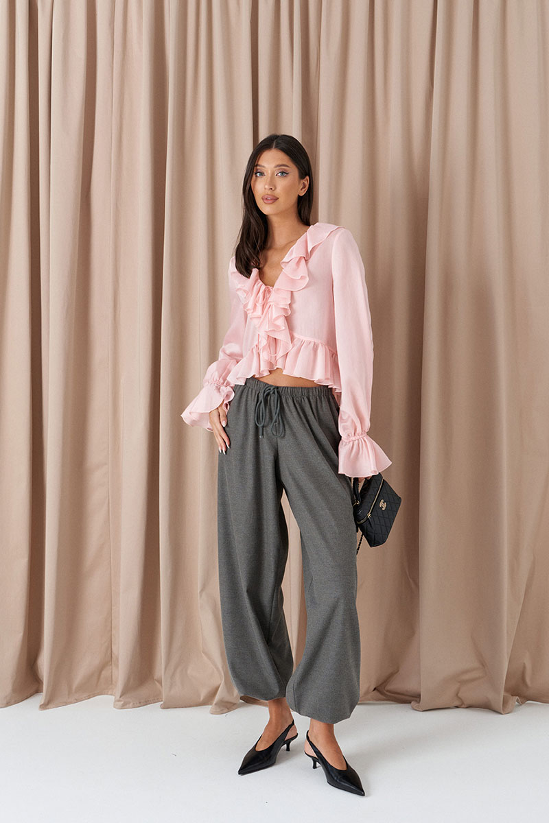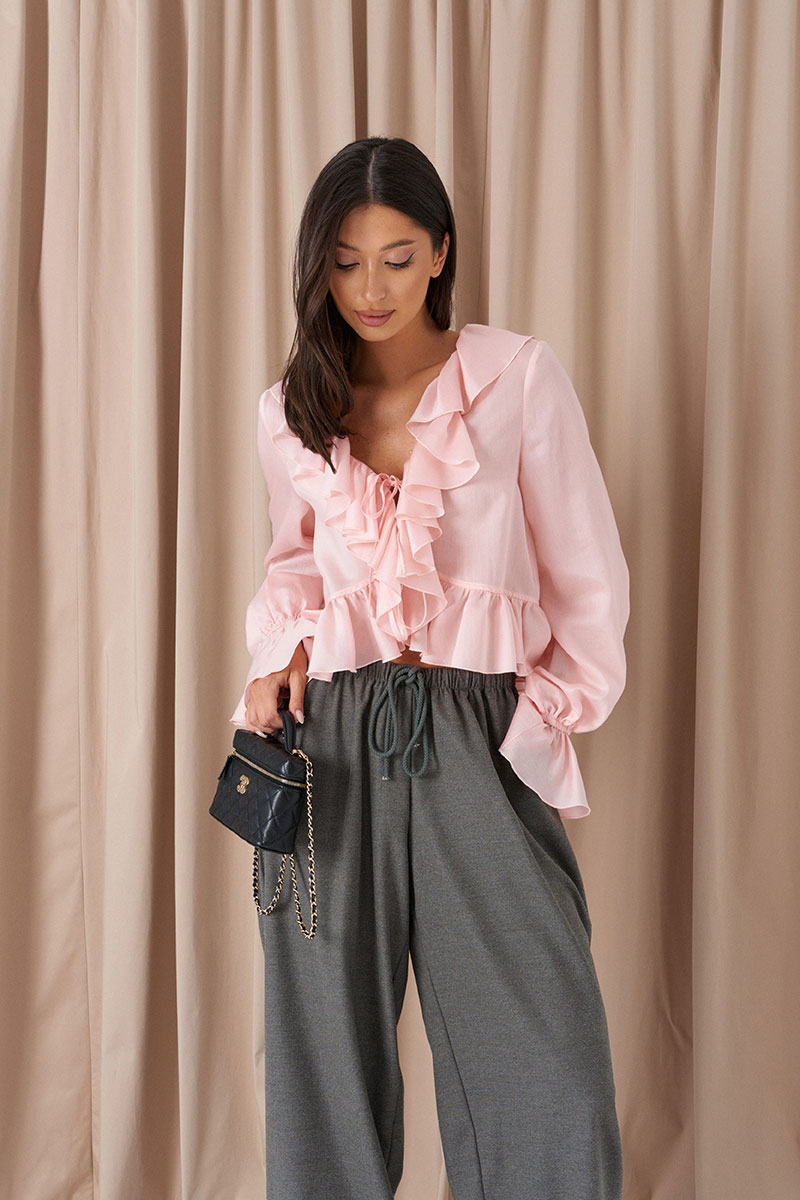 Блузка из полотна розового цвета. Характеристика: свободное облегание, укороченная, горловина V-образная, с притачной рюшей по всей длине горловины, борта и низа, застежка на шнурки-завязки, рукав втачной одношовный, притачной манжетой в виде волана.