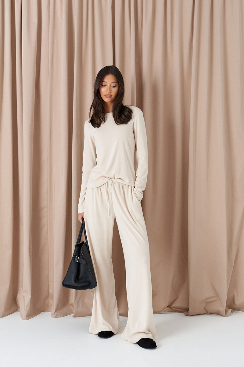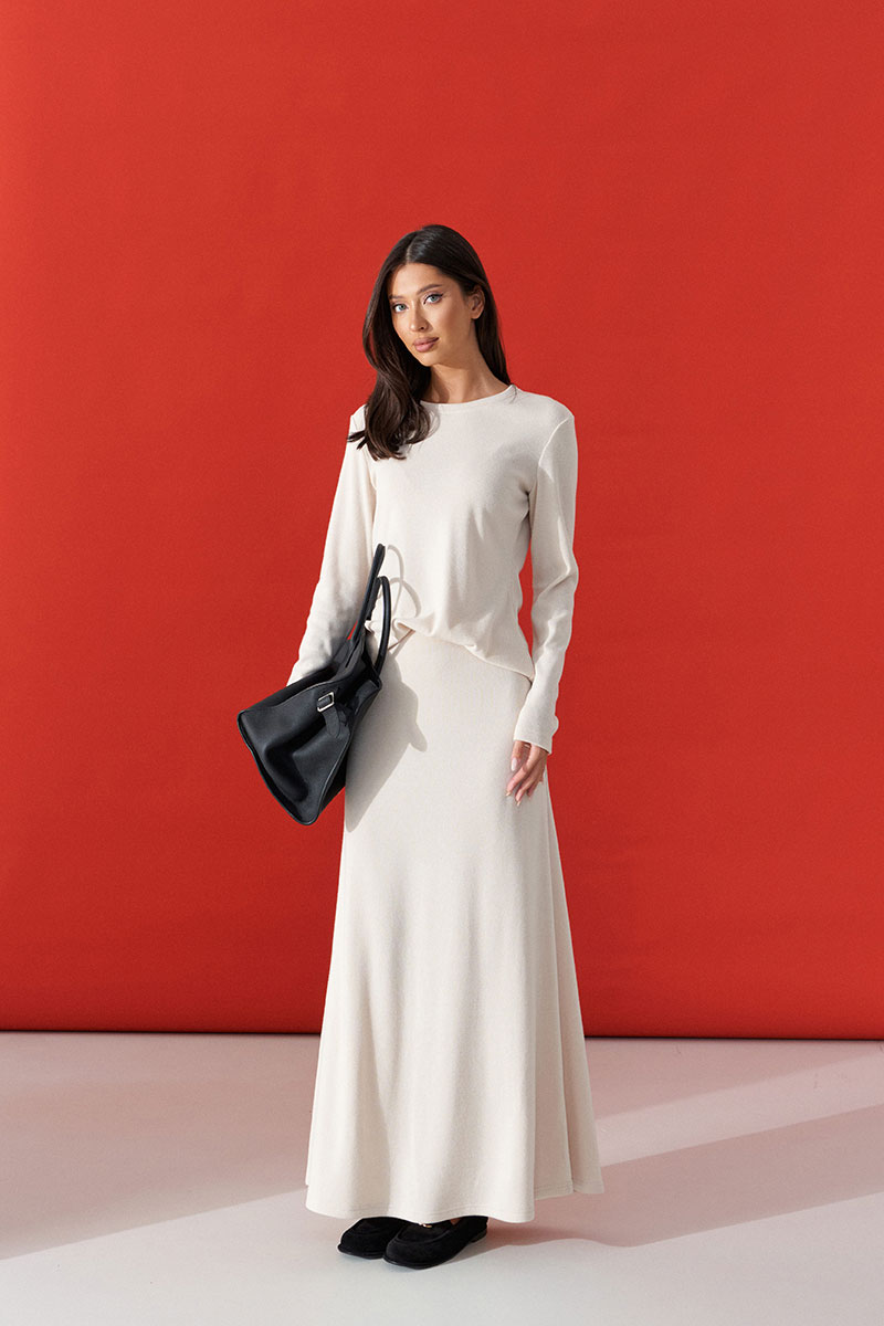 Джемпер выполнен из трикотажного полотна молочного цвета. Характеристики: полуприлегающий силуэт, овальная горловина. Рукав втачной.