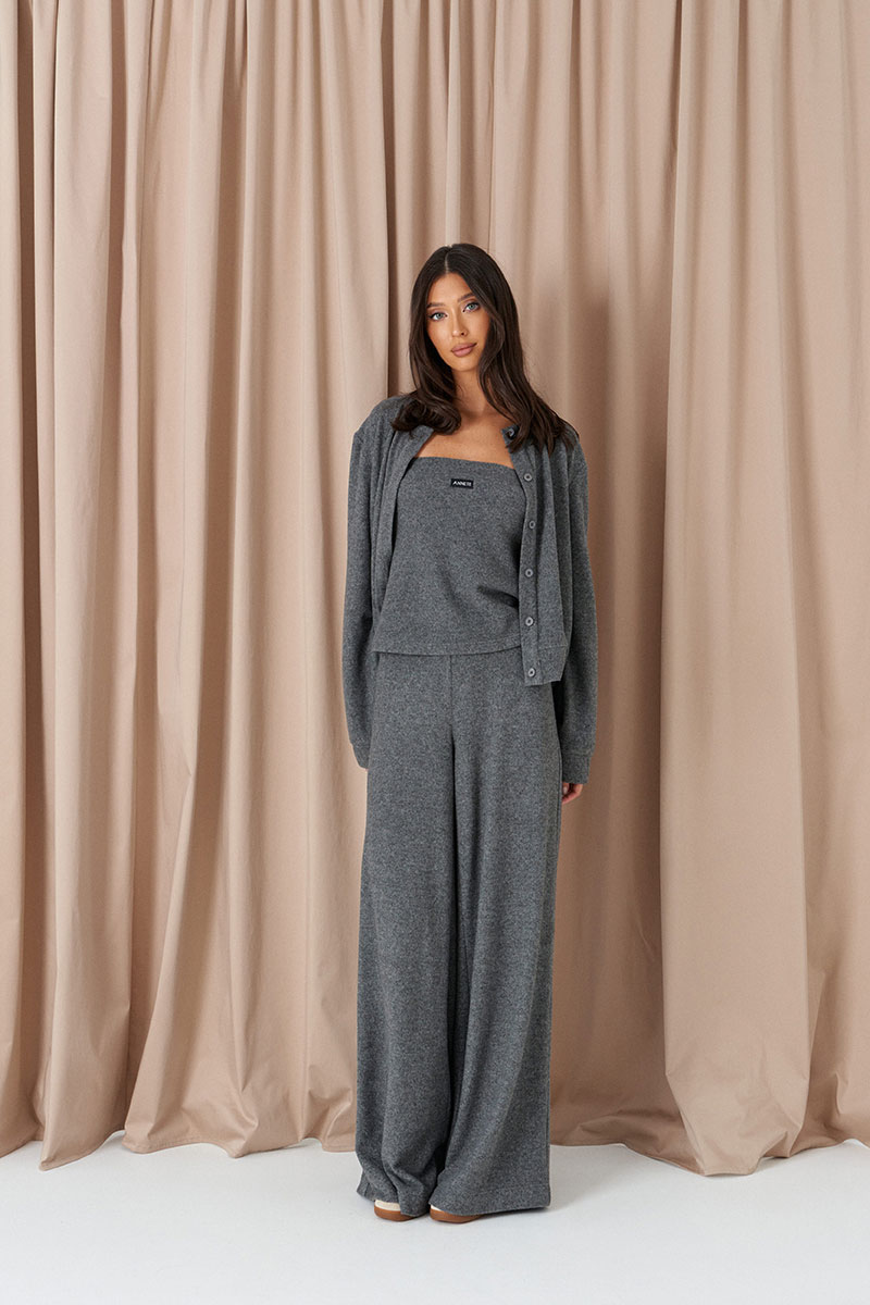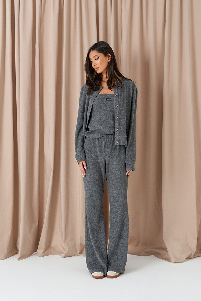 Джемпер прямого кроя, выполнен из трикотажного ворсистого полотна серого цвета. Характеристика: прямой крой, воротник стойка, застежка центральная планка на петли-пуговицы, по низу платная чуть заужена, рукав втачной, манжет широкий.