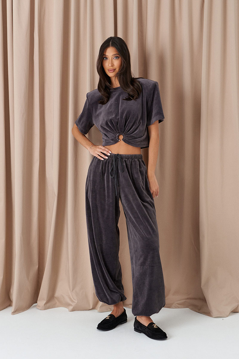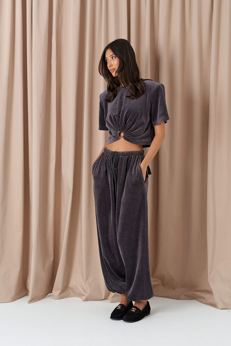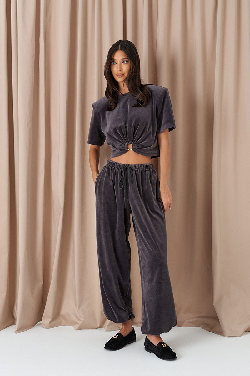 Футболка прямого кроя, выполнена из полотна велюра графитового цвета. Характеристика: укороченая, прямой свободный крой, горловина овальная, рукав слегка спущен, подплечники, спереди декоративная сборка на элемент-полукольцо.
