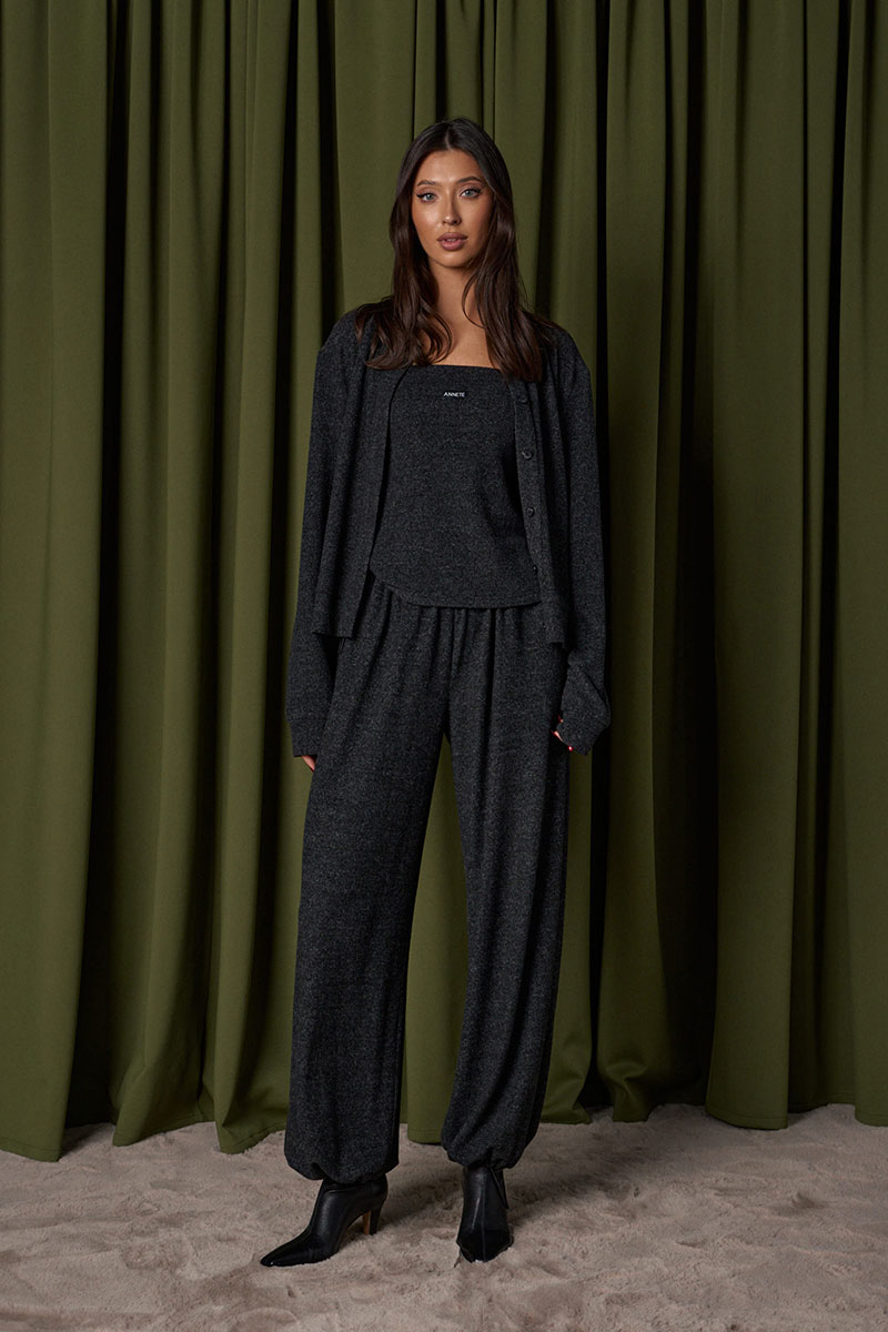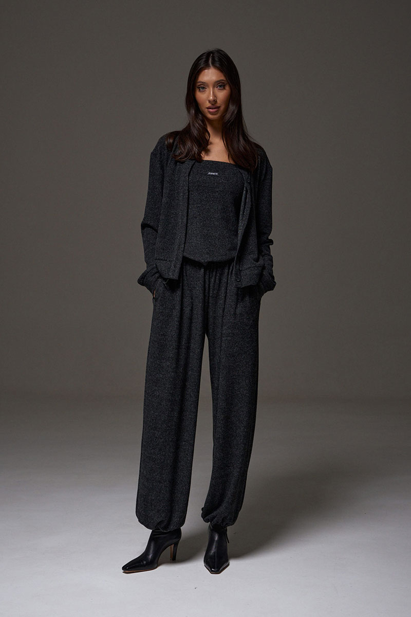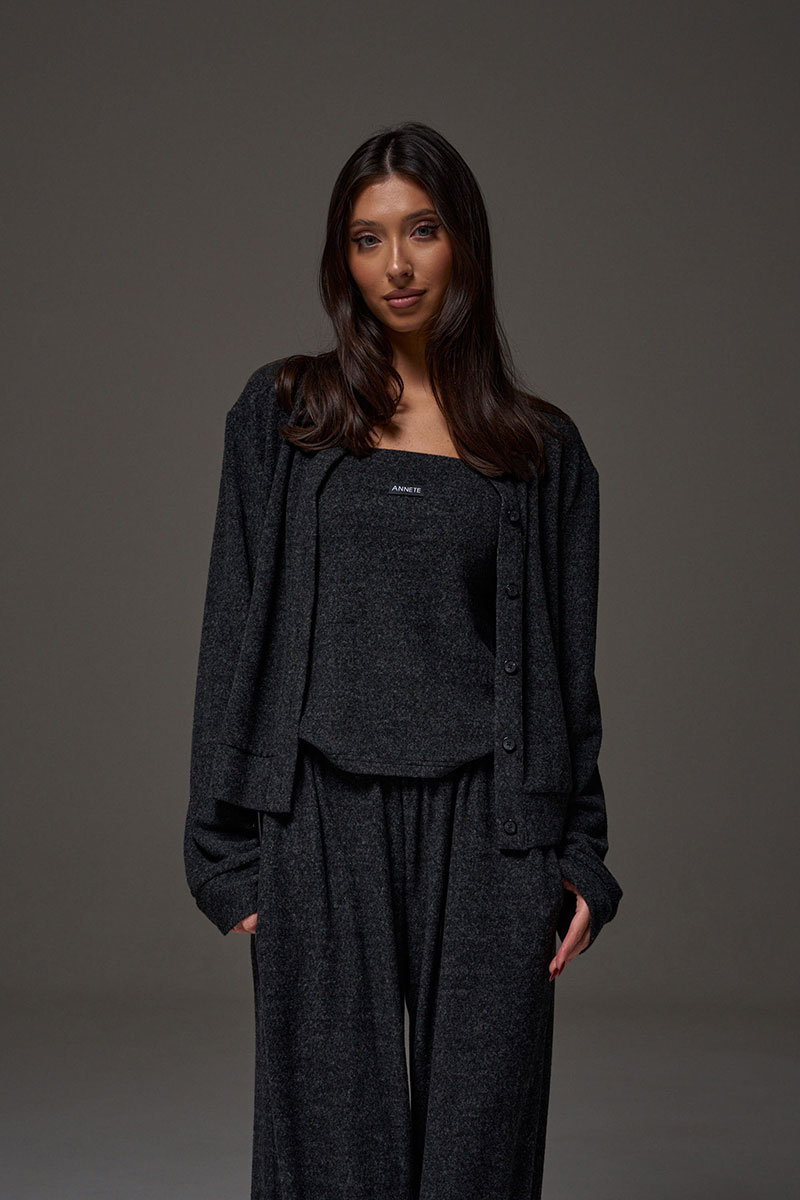 Топ прямого кроя с открытыми плечами, выполнен из трикотажного ворсистого полотна графитового цвета. Характеристика: прямой крой, верх изделия по передней и задней части на резинке, спереди брендированная нашивка.