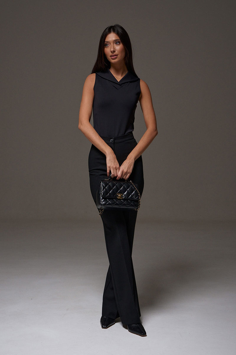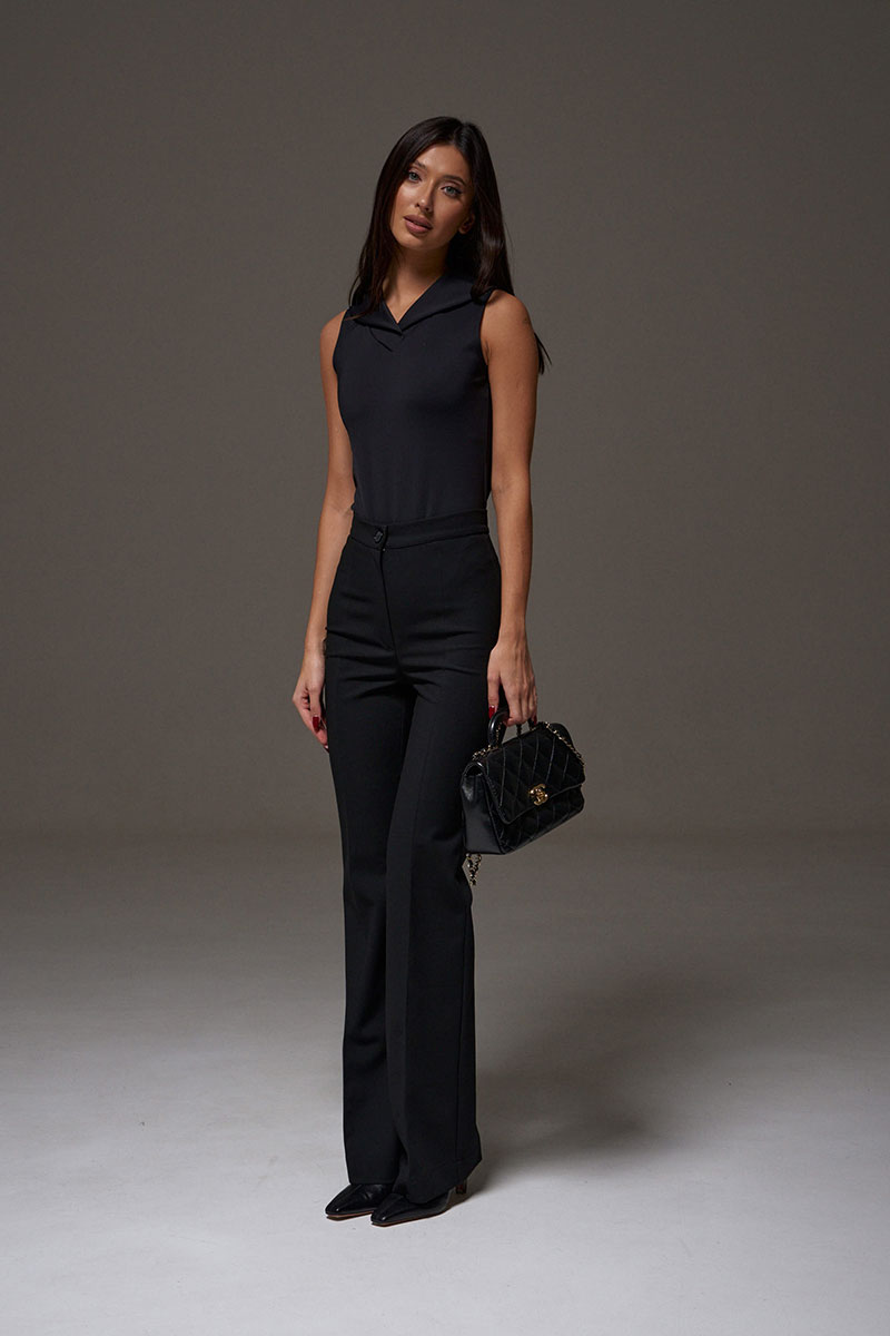 Боди прилегающего силуэта выполнен из эластичного полотна. Характеристики: прилегающий силуэт, горловина стойка, по низу застежки на три кнопки.