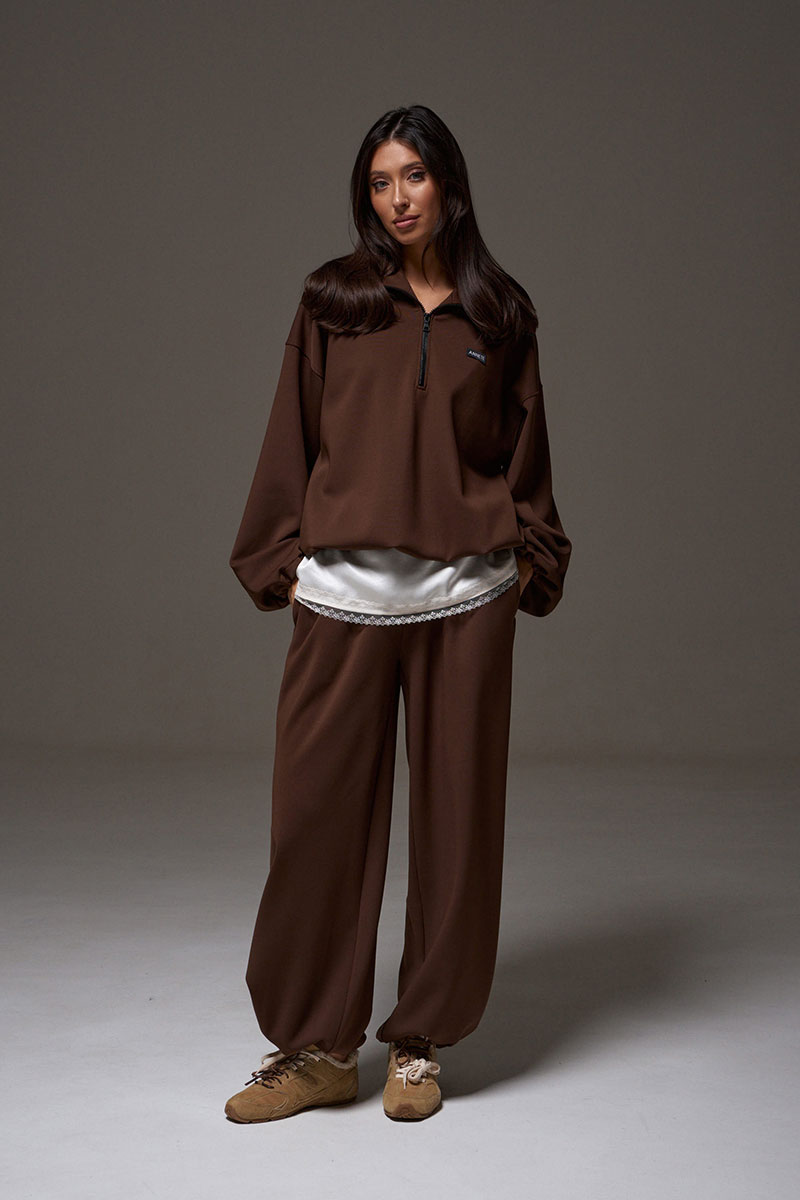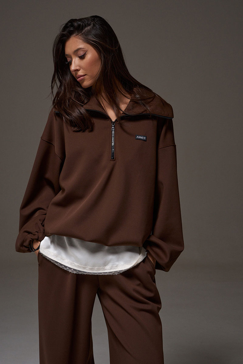 Джемпер прямого свободного кроя выполнен из трикотажного полотна шоколадного цвета. Характеристики: прямой крой, широкий отложной воротник, центральная застежка-молния, рукав втачной спущенный, манжет на резинке с фиксаторами, по низу изделие собирается на резинку с фиксаторами.
