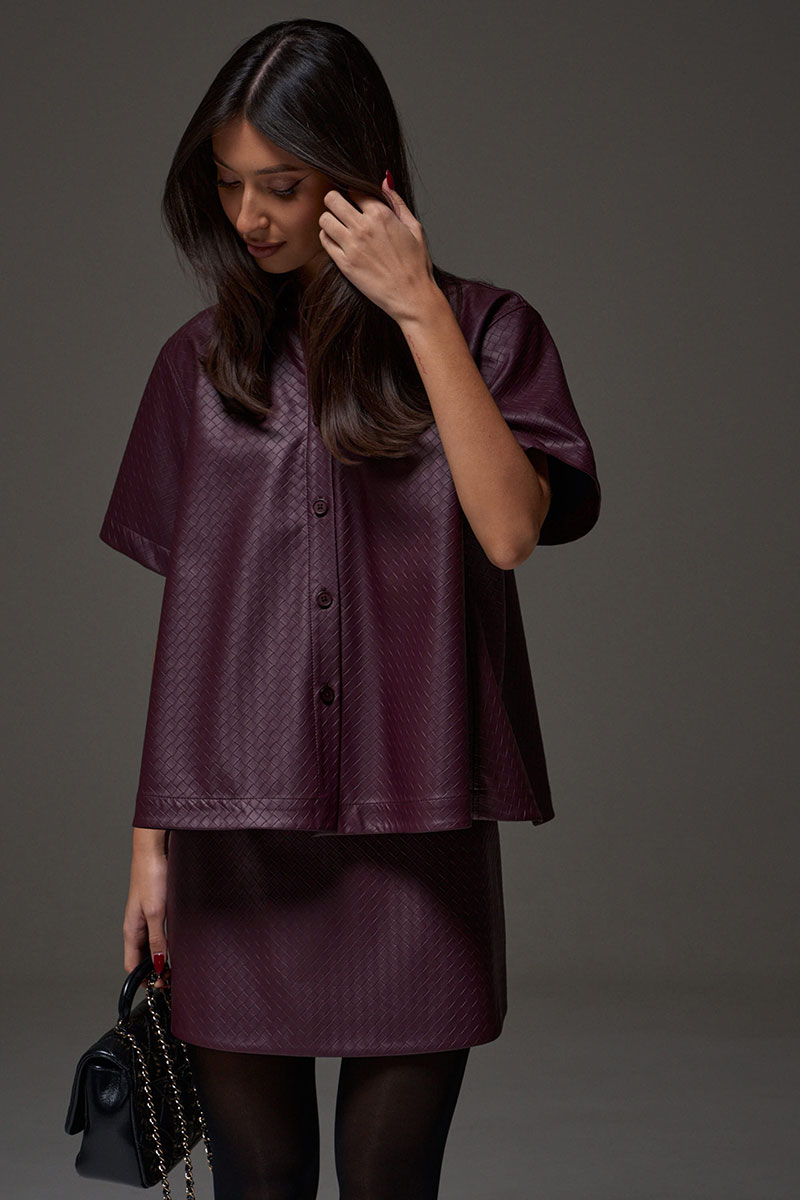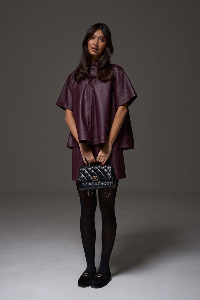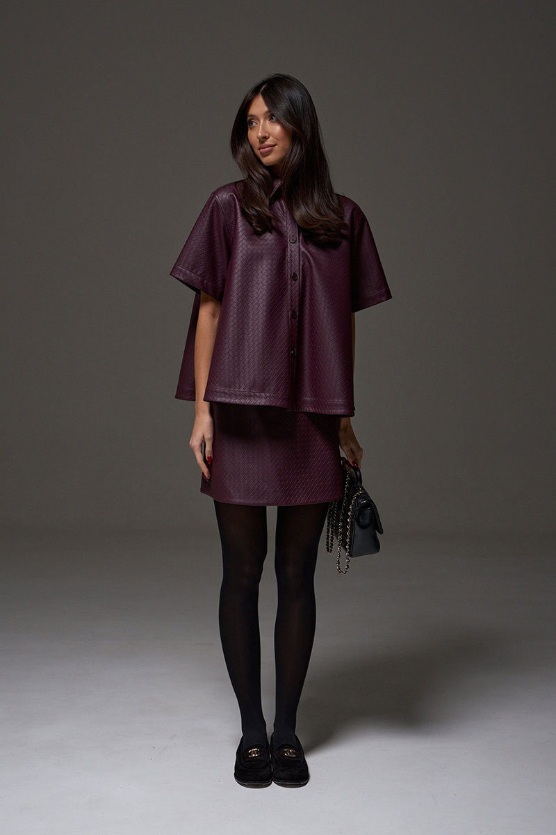 Блузон свободного кроя, выполнен из фактурной экокожи бордового цвета. Характеристика: свободный крой, отложной воротник,застежка центральная на петли пуговицы, рукав втачной укороченный. Спинка цельнокроеная.