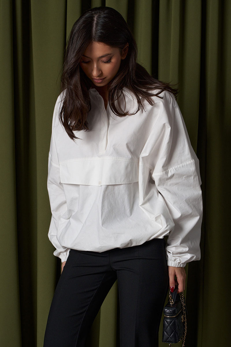Блузон прямого свободного кроя выполнен из хлопковой ткани. Характеристики: отложной воротник, застежка центральная на петли пуговицы, по переду имитация кармана. Низ изделия на резинке с фиксатором. Плечо спущенно, рукав свободный, низ рукава на резинке.