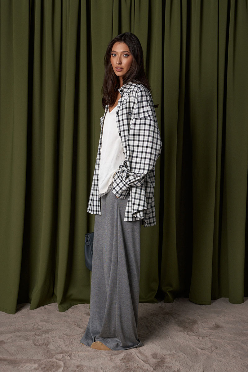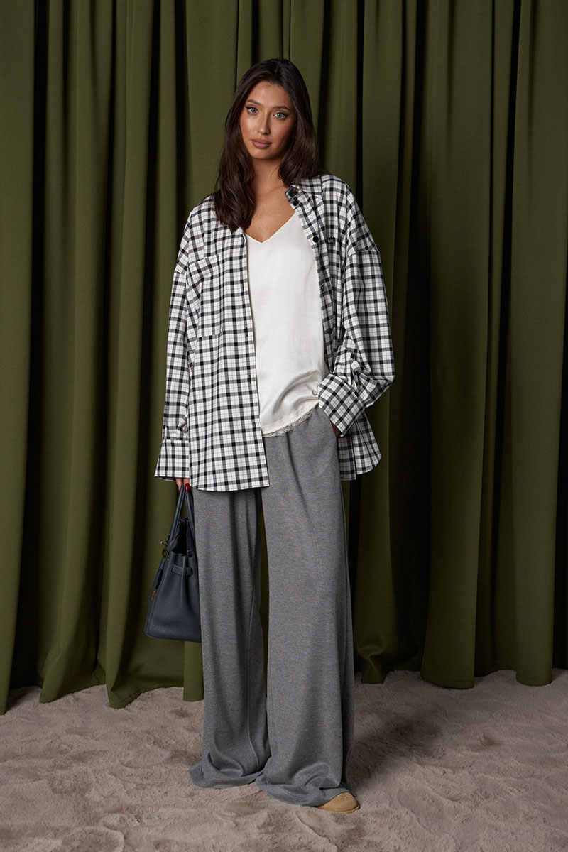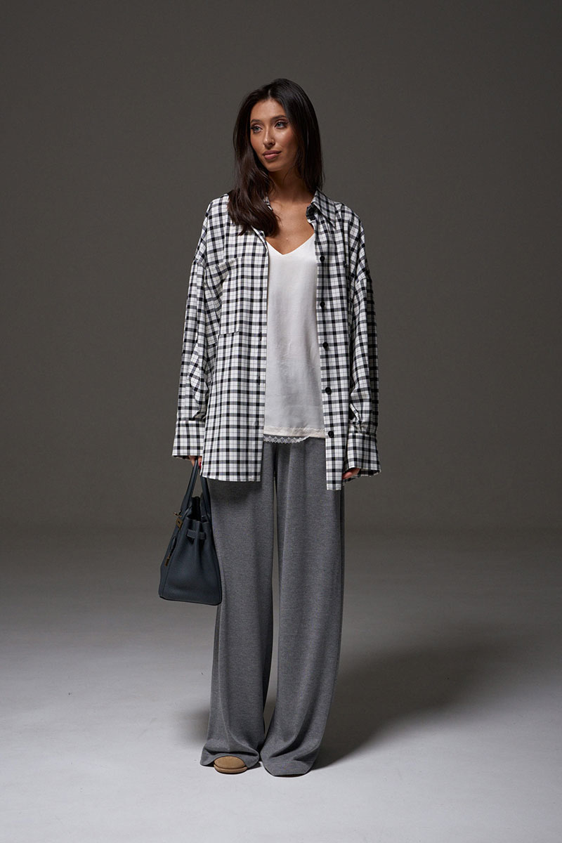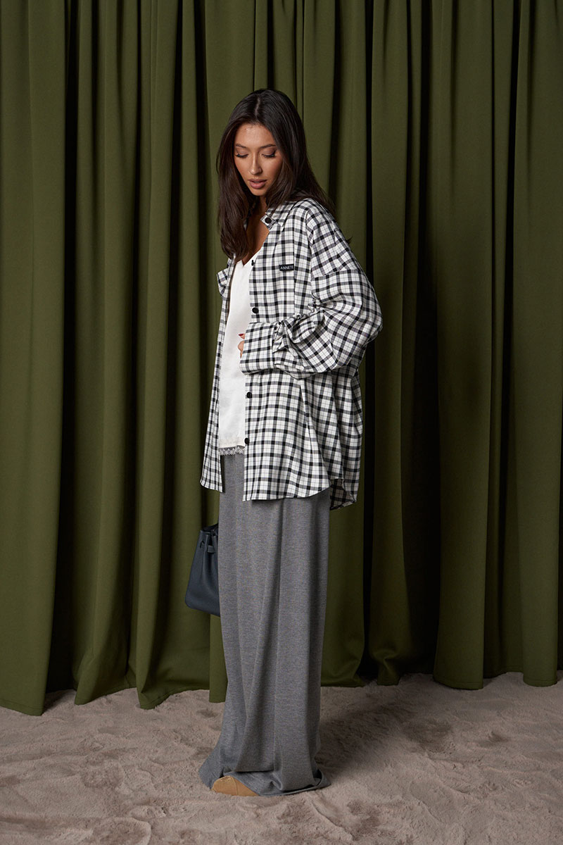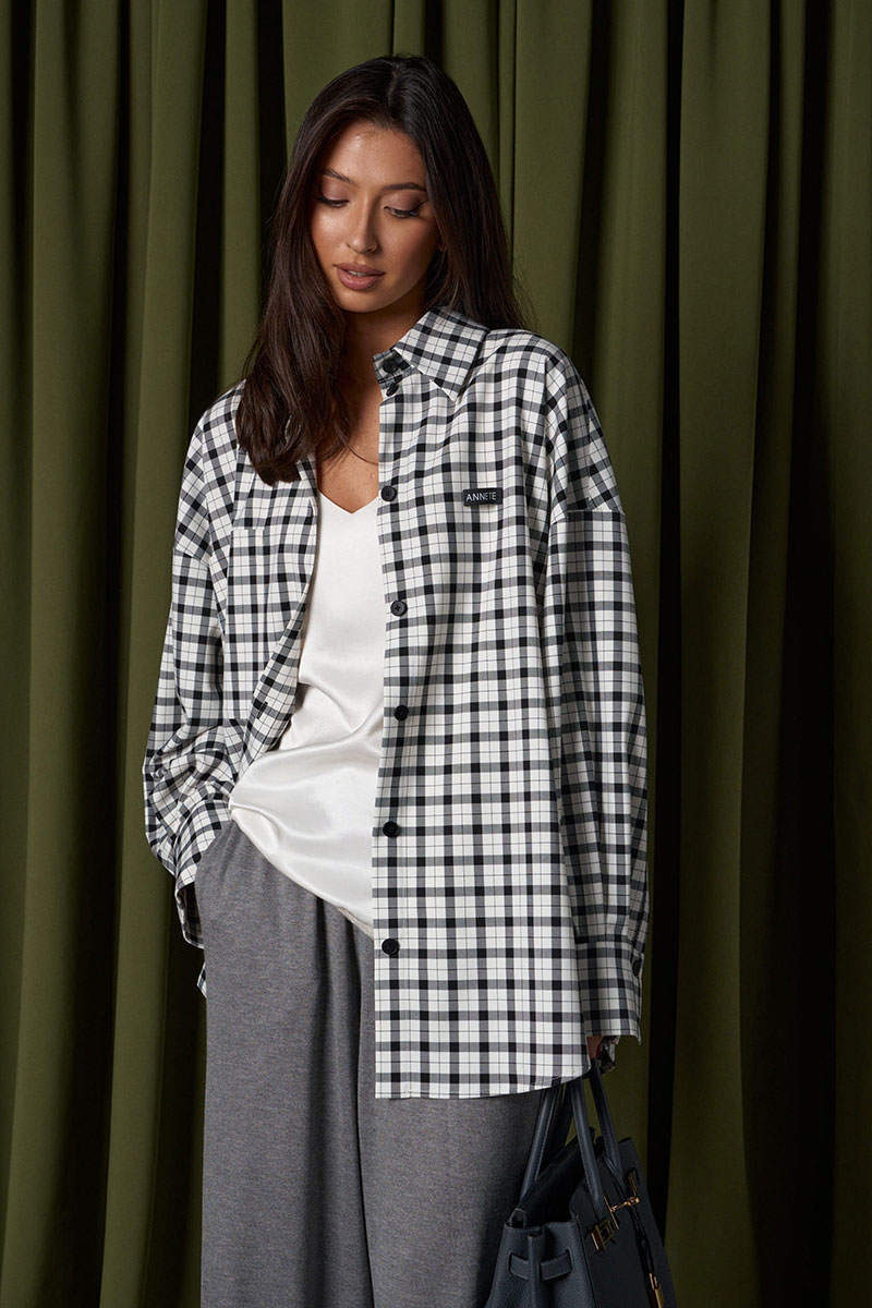 Рубашка прямого свободного кроя, выполнена из текстильного полотна в черно-белую клетку. Характеристика: воротник отложной, застёжка центральная на пуговицы, по переду справа на уровне линии груди накладной карман, слева - брендированная нашивка Annete, рукав спущенный свободный, с манжетой на пуговице, спинка отрезная со сборкой.