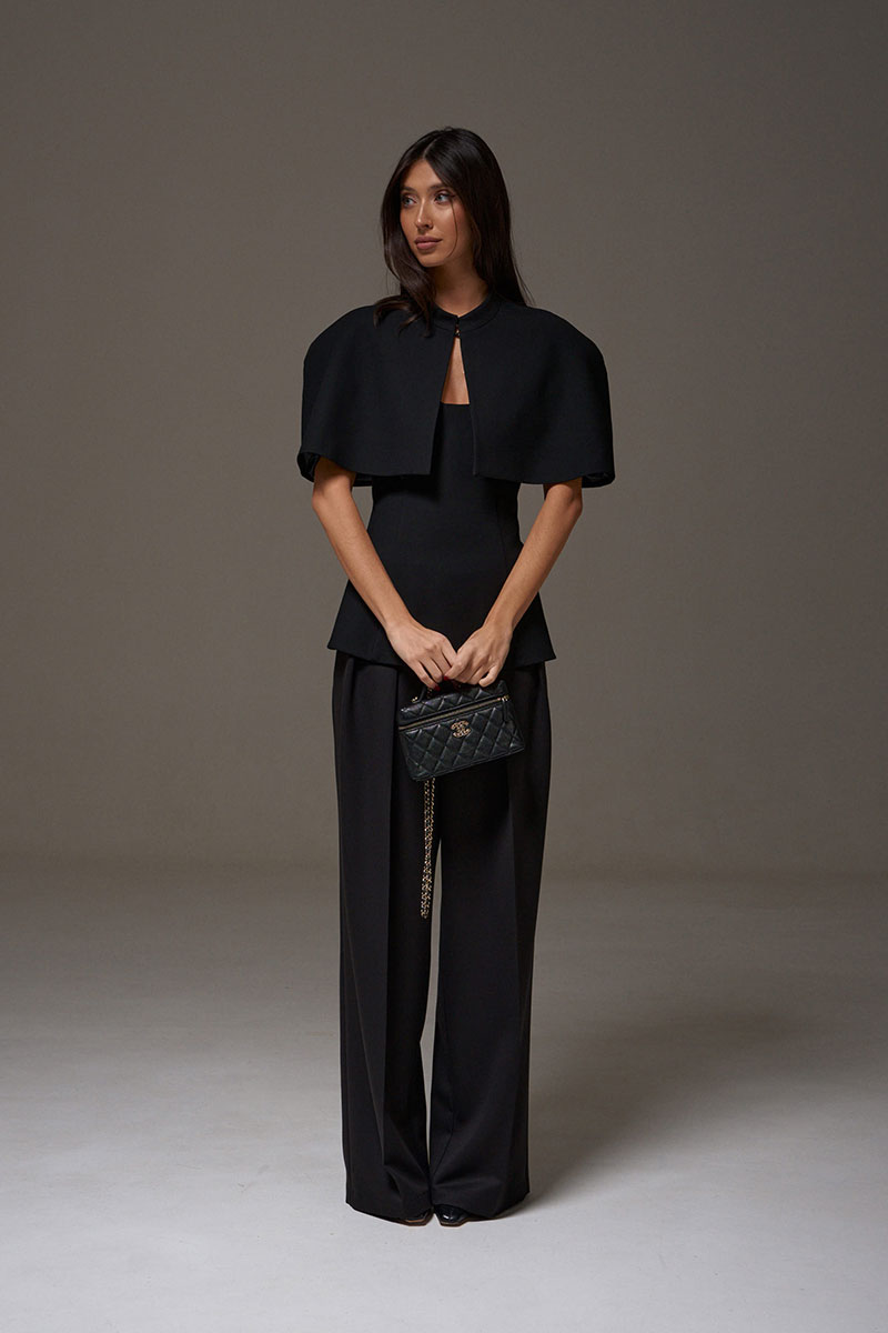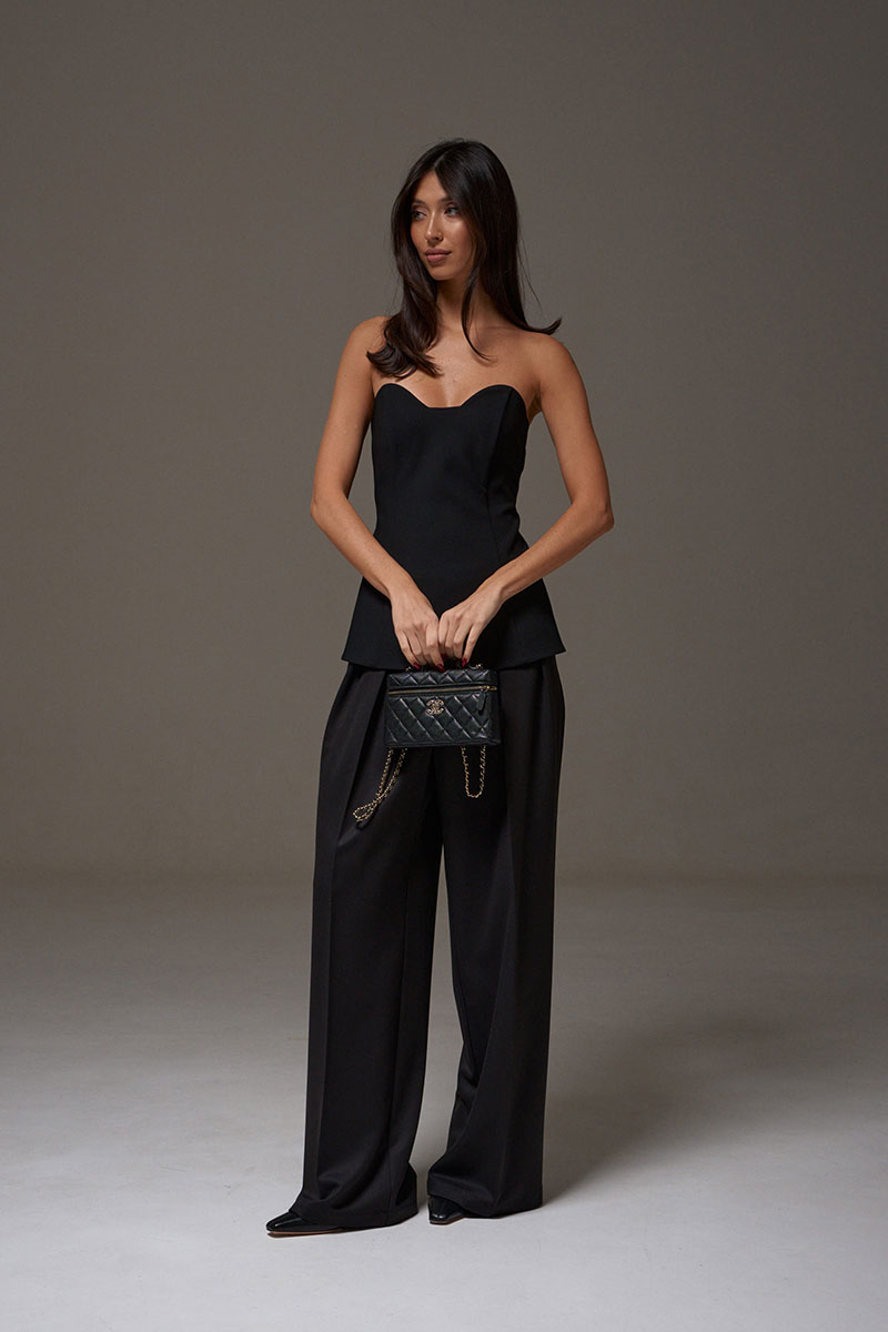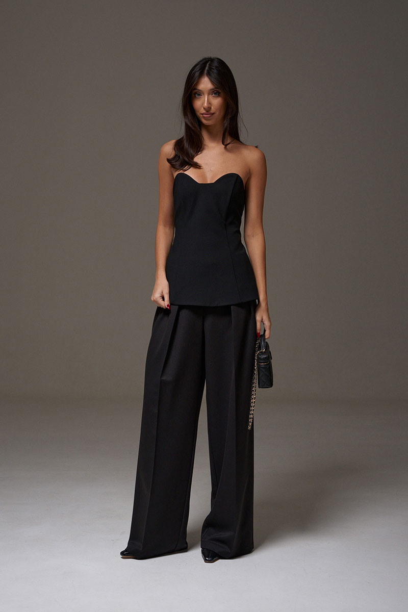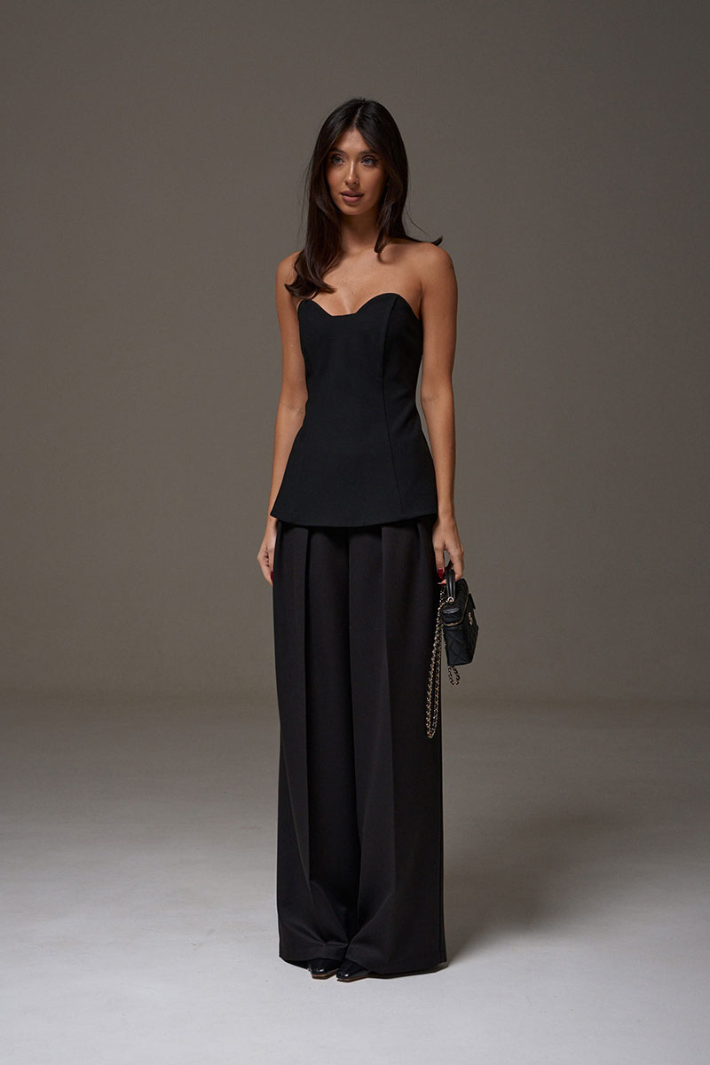 Блузон с фигурным вырезом выполнен из костюмного полотна черного цвета. Характеристики: прилегающий силуэт, подкладка, фигурный вырез горловины, по передней части изделия и в боковых швах упругие узкие пластины, по заднему полотну в среднем шве потайная молния.