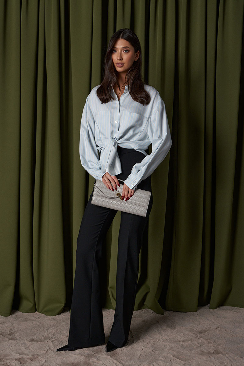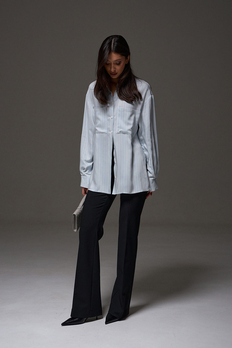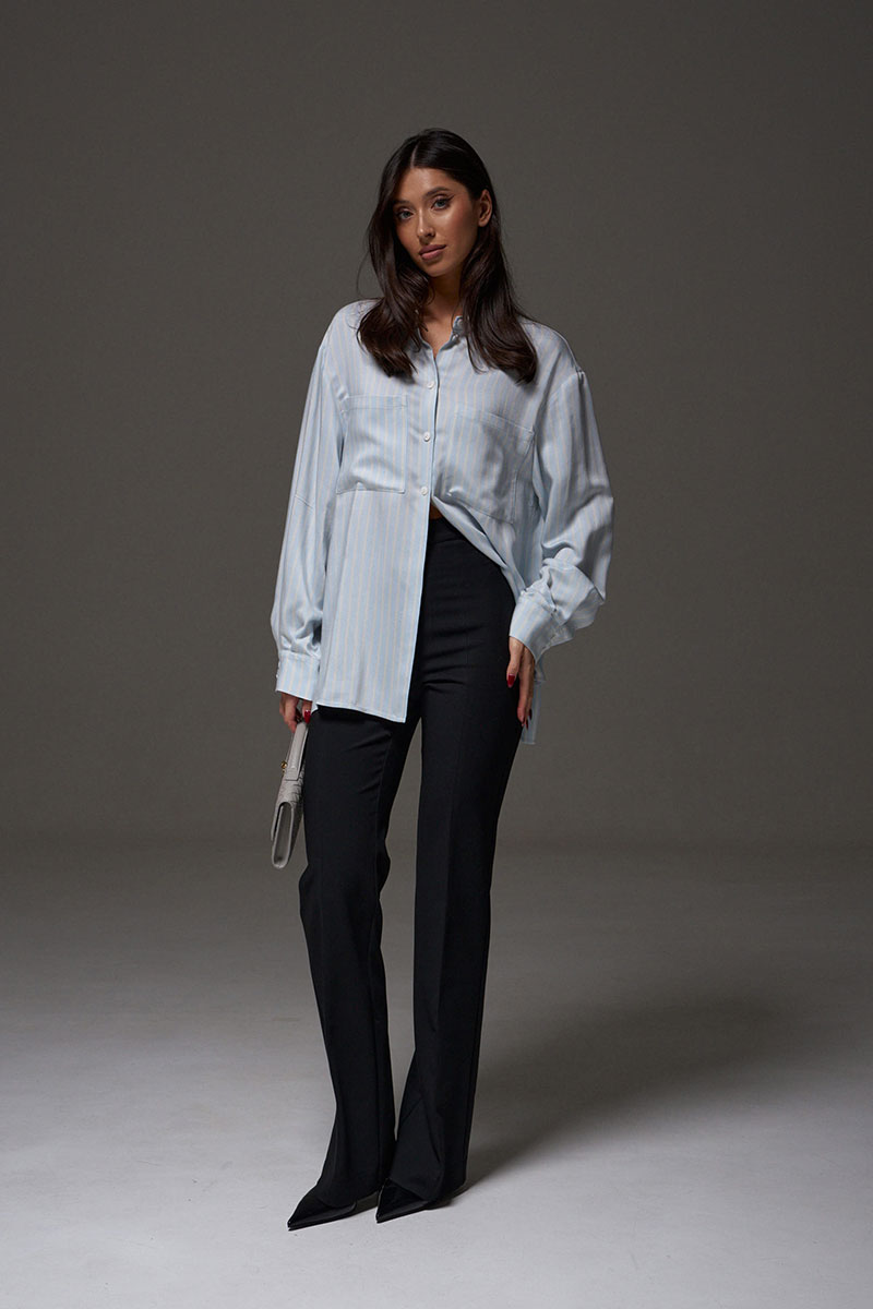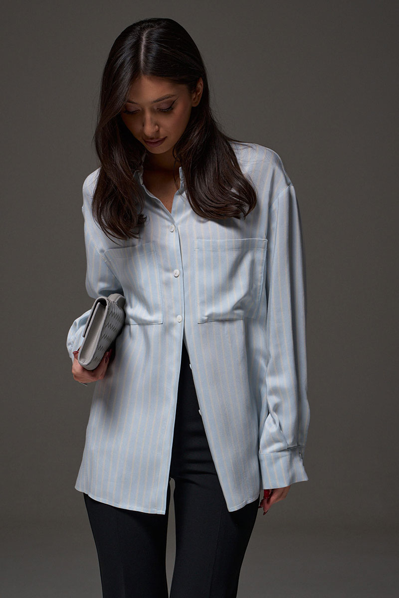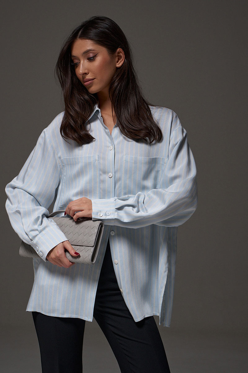 Рубашка свободного кроя выполнена из тексильного мягкого полотна небесного цвета в белую полоску. Характеристики: прямой крой, отложной воротник, застежка центраяльная на петли-пуговицы, рукав втачной, немного спущен, широкая манжета на двух пуговицах, в боковых швах разрезы 27см, на груди функциональные накладные карманы.