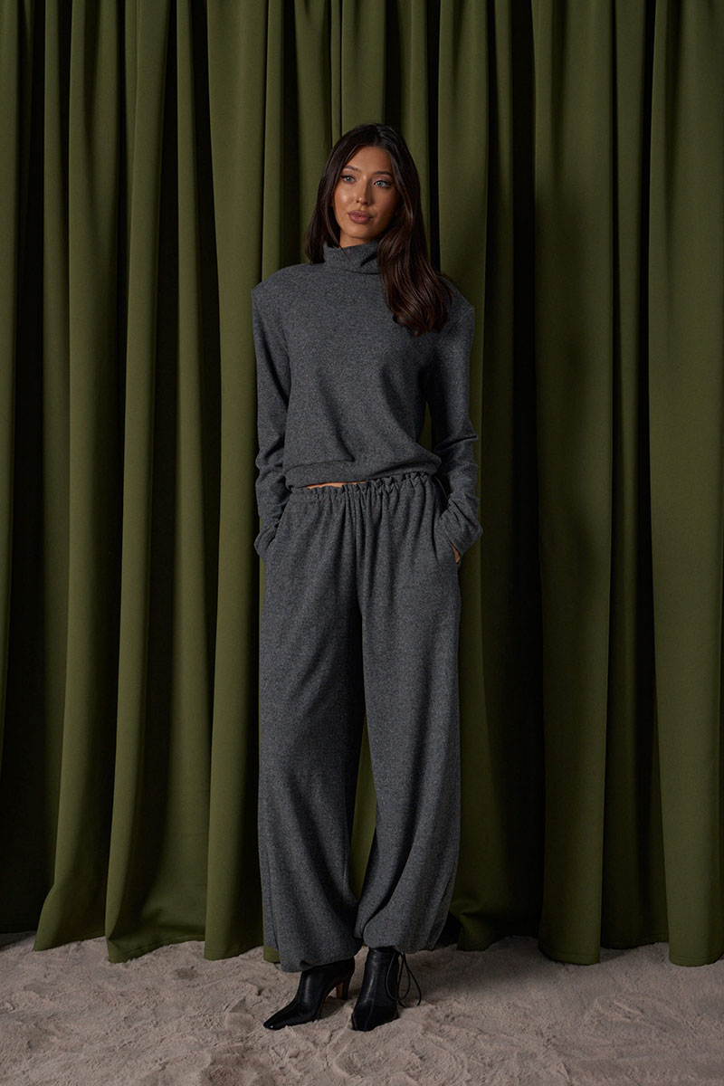 Джемпер укороченный прямого свободного кроя. Выполнен из мягкого трикотажа светло-серого цвета. Выполнен из мягкого трикотажа тёмно-серого цвета. Горловина-стойка, в естественную складку. Есть подплечники (съёмные).
