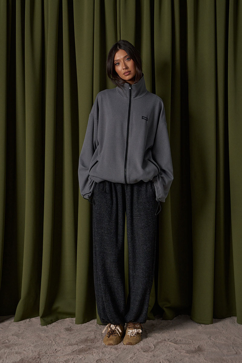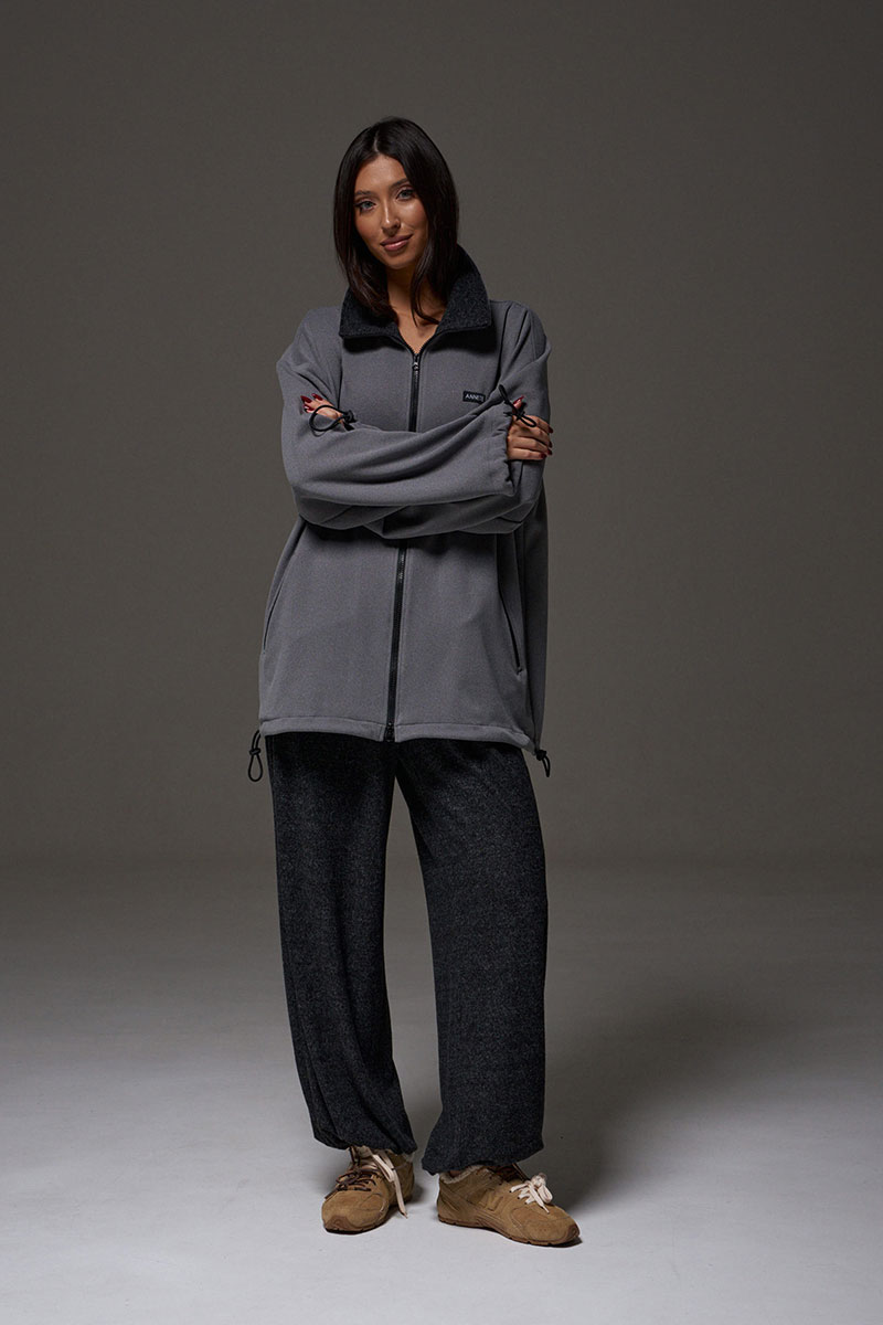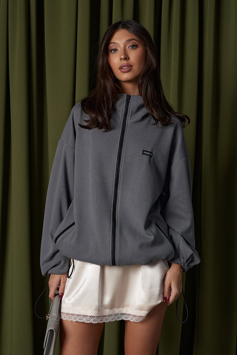 Джемпер прямого силуэта, выполнен из трикотажного полотна серого цвета. Характеристики: горловина круглая, воротник стойка черного цвета, рукав втачной, спущен, по низу рукава кулиса с втянутым шнуром-резинкой, регулируемой фиксаторами, прорезные карманы на молниях, спереди брендированная нашивка. Застежка центральная на молнию. По низу изделия кулиса с втянутым шнуром-резинкой, регулируемой фиксаторами.