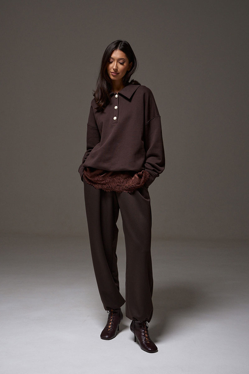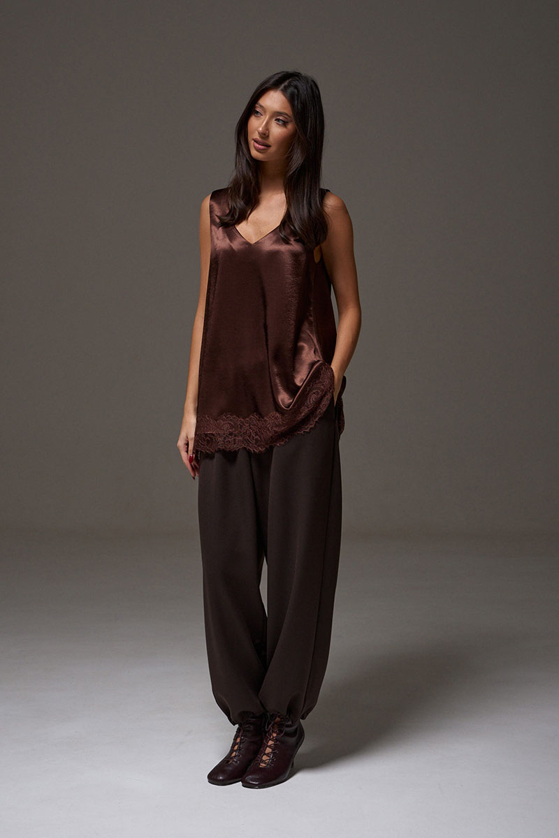 Блузон в крое трапеция, выполнен из струящейся ткани коричневого цвета. Характеристика: крой трапеция - расширяется к низу, широкие бретели, спереди v-образный вырез, по спинке овальная горловина, спинка изделия чуть удлинена, по низу изделия пришито кружево.