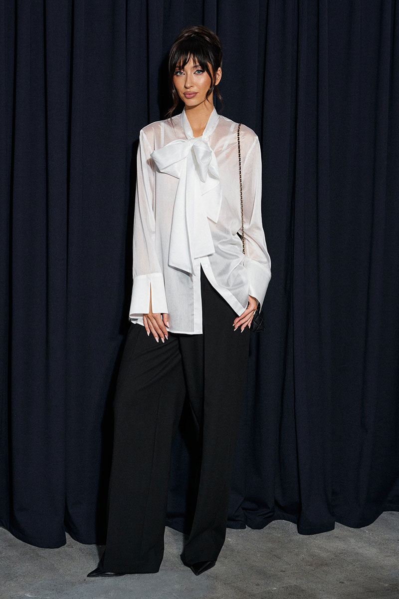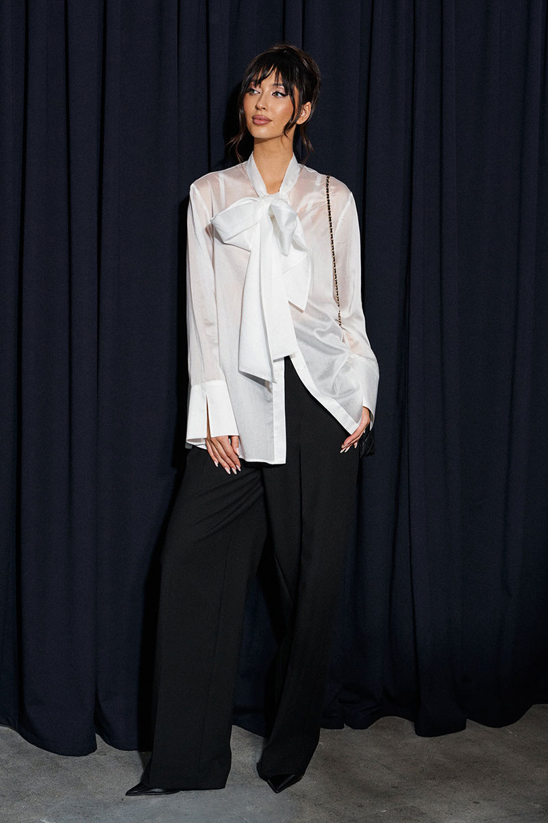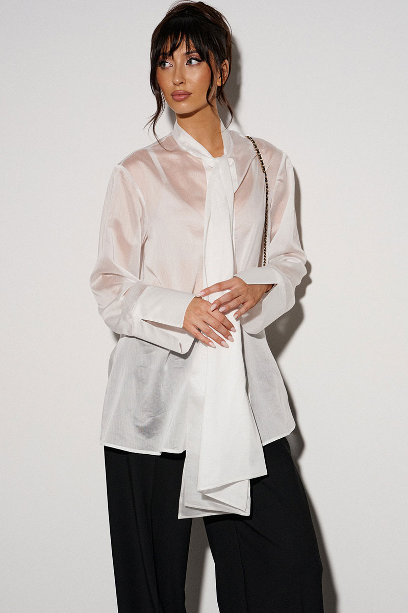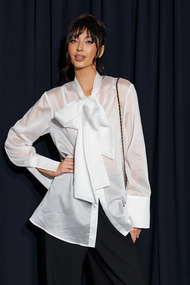 Блузка прямого кроя, выполнена из легкого струящегося полотна белого цвета. Характеристики: прямой крой, застежка центральная на петли пуговицы, втачной рукав с широкой манжетой по низу, воротник-стойка с бантовыми завязками по переду.