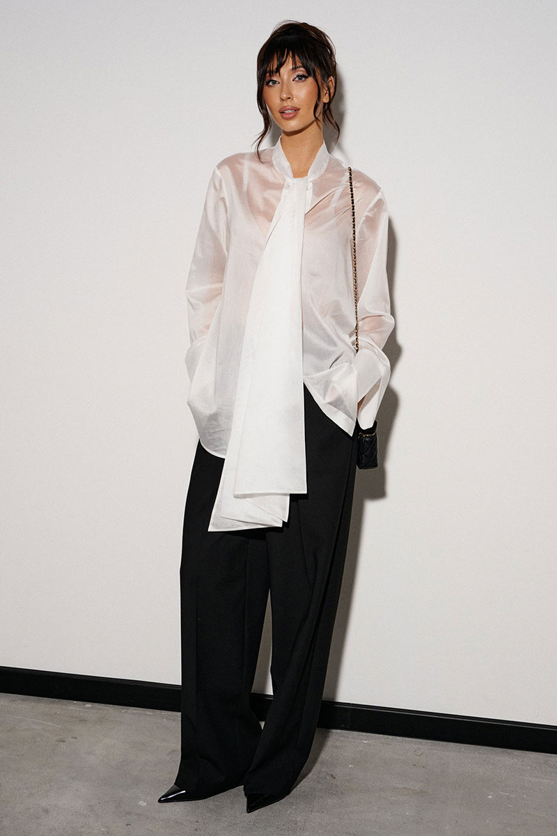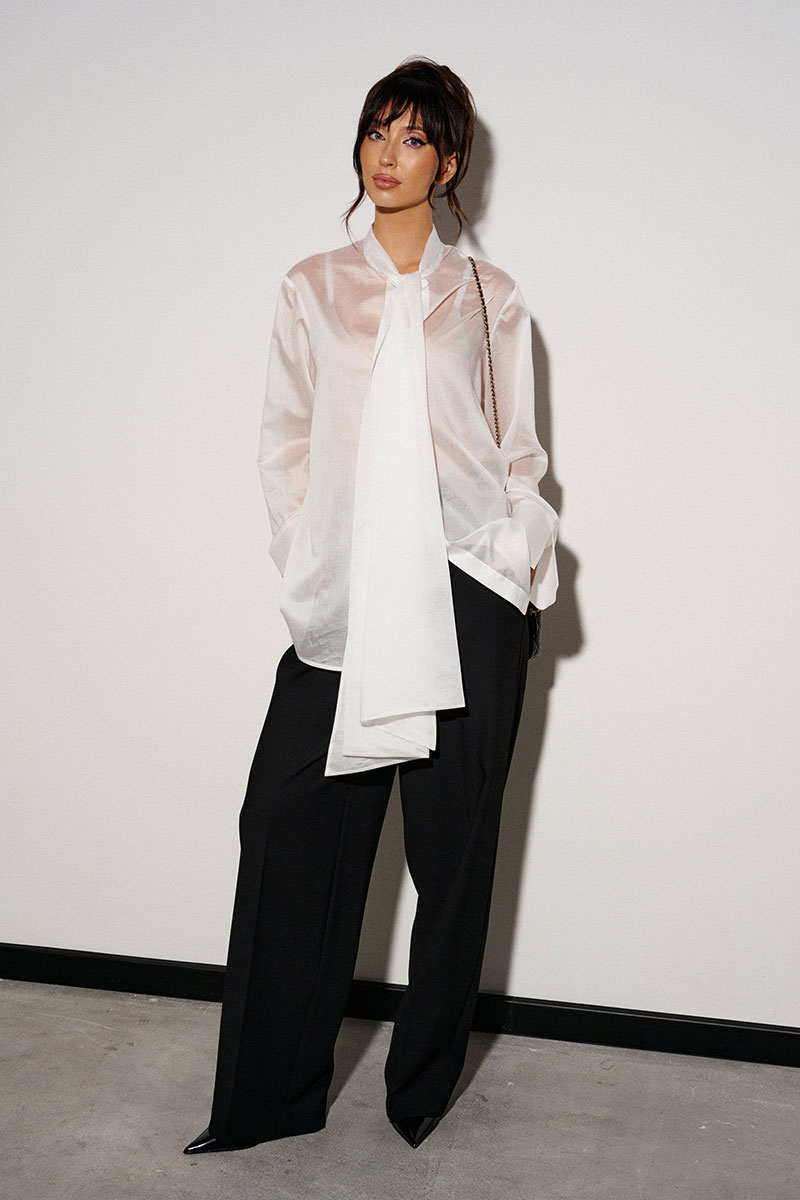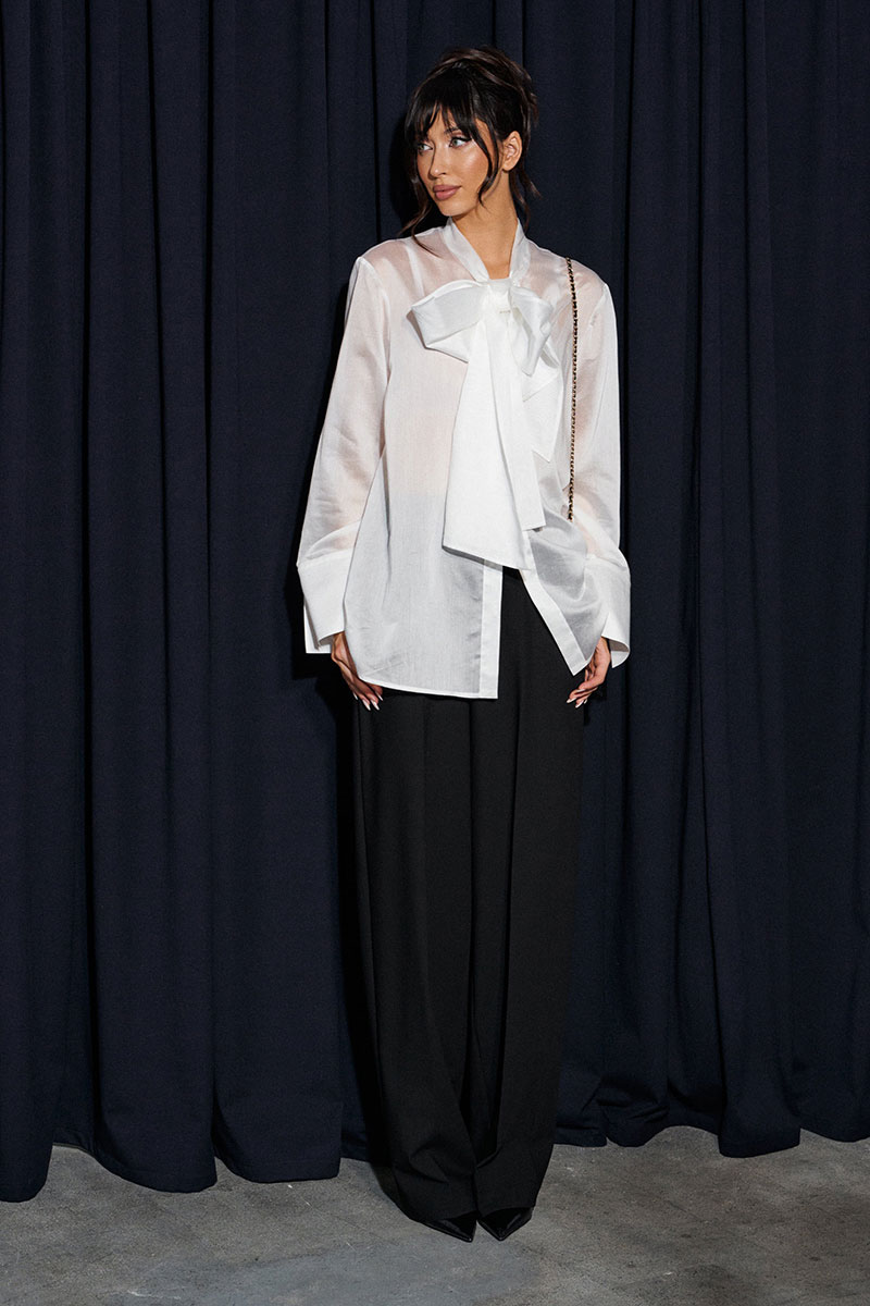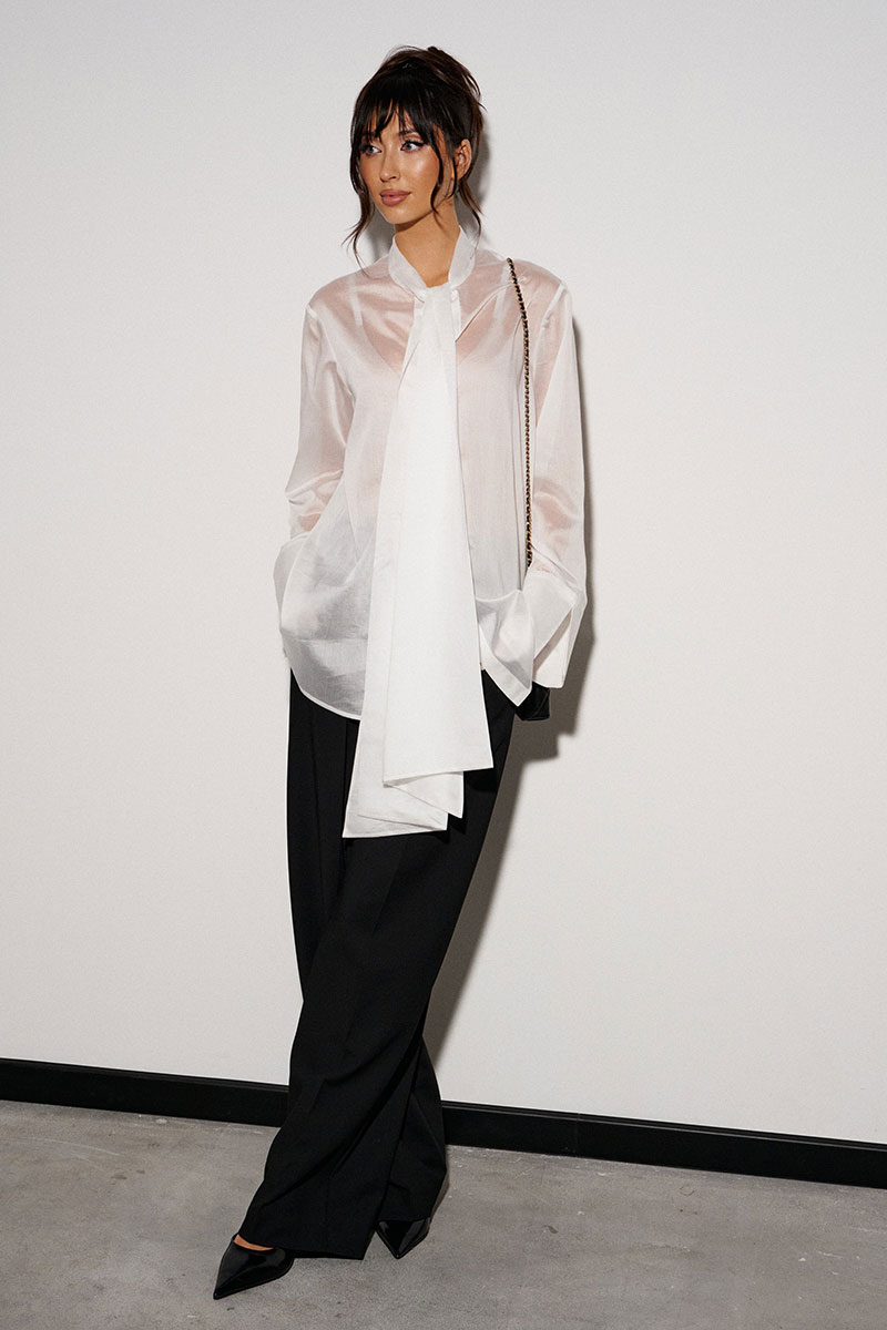 Блузка прямого кроя, выполнена из легкого струящегося полотна белого цвета. Характеристики: прямой крой, застежка центральная на петли пуговицы, втачной рукав с широкой манжетой по низу, воротник-стойка с бантовыми завязками по переду.