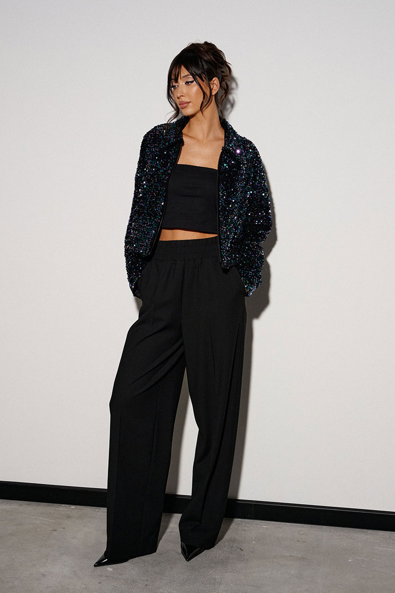 Джемпер свободного кроя. Выполнен из бархатной ткани чёрного цвета с пайетками. С подкладкой. Воротник отложной. Вырез горловины круглый. Рукав втачной, спущенный. Застёжка центральная - молния.