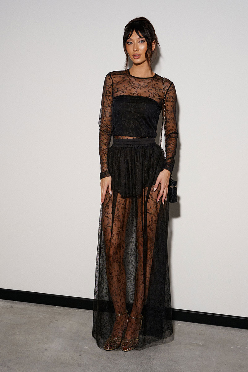 Джемпер (лонгслив) полуприлегающего силуэта. Выполнен из сетчатой ткани чёрного цвета с узором. Вырез горловины круглый. Рукав втачной. Низ изделия и рукава с не обработанным краем.