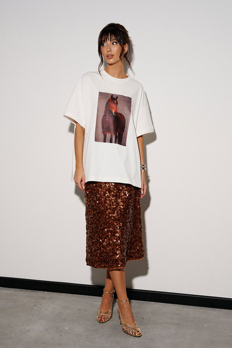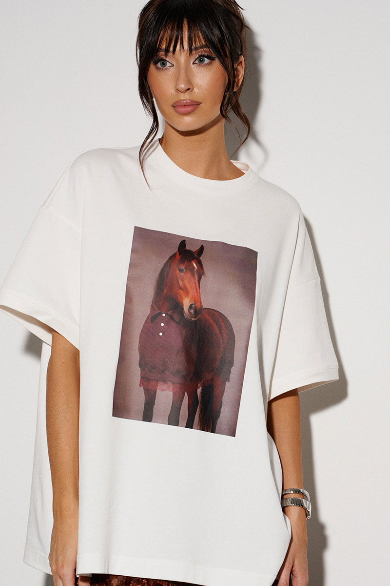 Футболка прямого свободного кроя, выполнена из трикотажного полотна молочного цвета. Характеристика: прямой крой, овальная горловина. Рукав спущен. Спинка цельнокраеная, по переду напечатан принт.
