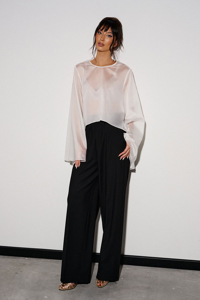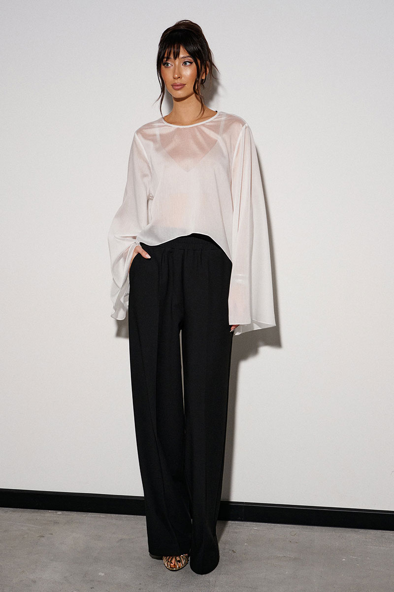 Блузон свободного прямого кроя, выполнен из тонкого белого полотна. Характеристика: свободный крой, овальная горловина. Рукав втачной, свободного кроя, расклешенный к низу. Спинка цельнокроеная, по переду изделия срез.