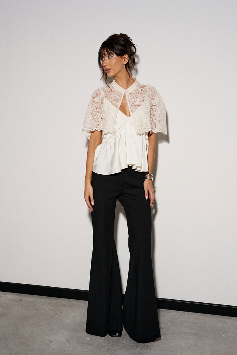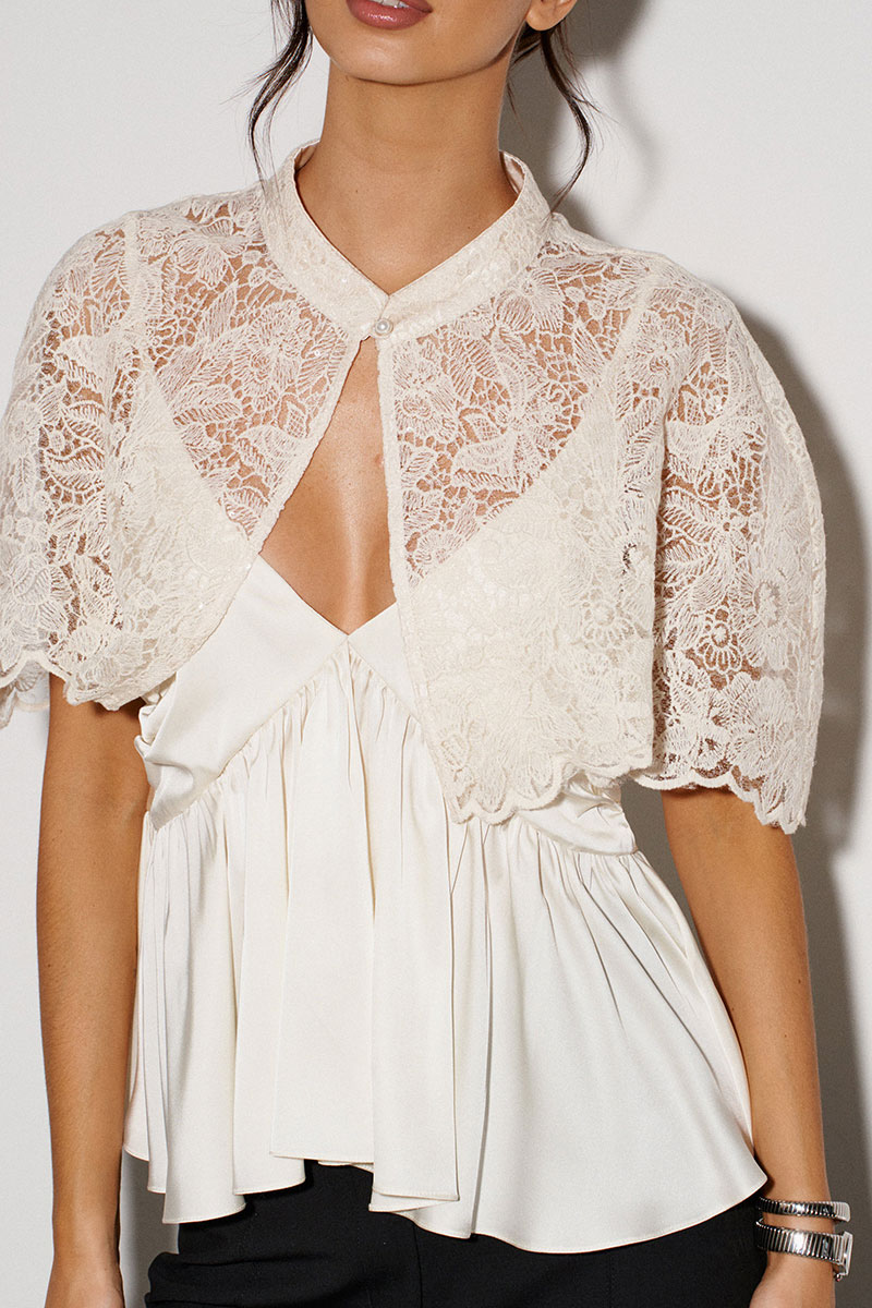 Кейп выполнен из кружевного сатинового полотна молочного цвета. Характеристики: горловина стойка, застежка центральная на пуговицу.