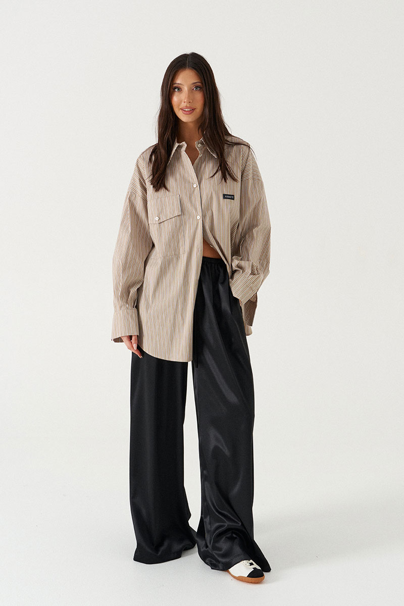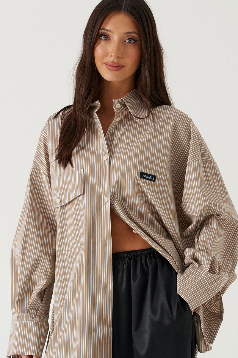 Рубашка прямого свободного кроя, выполнена из полотна цвета капучино в бело-черную полоску. Характеристика: воротник отложной, застёжка центральная на пуговицы, по переду справа на уровне линии груди накладной карман, слева - брендированная нашивка Annete, рукав спущенный свободный, с широкой манжетой на пуговице, спинка отрезная с скоалками.